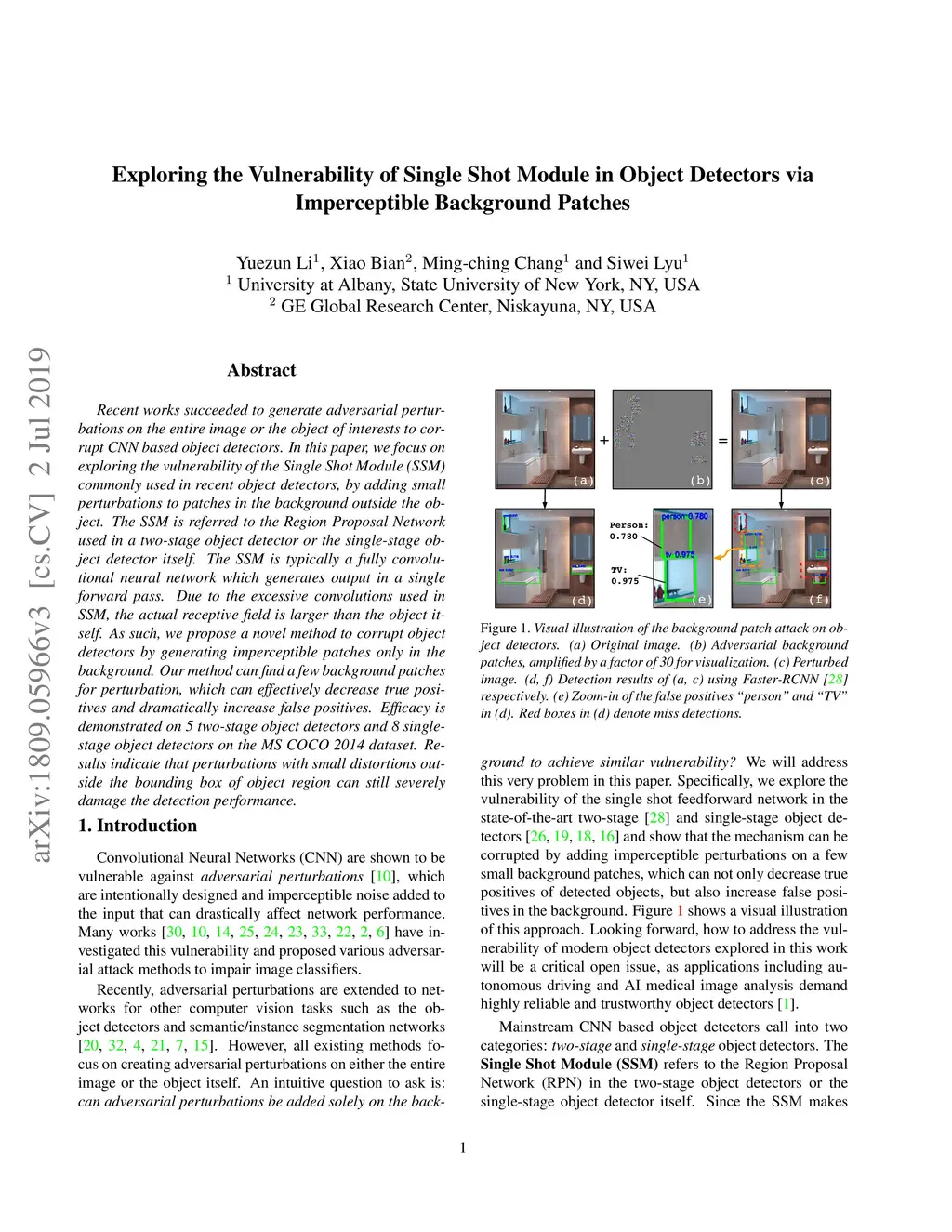 Recent works succeeded to generate adversarial perturbations on the entire image or the object of interests to corrupt CNN based object detectors. In this paper, we focus on exploring the vulnerability of the Single Shot Module (SSM) commonly used in recent object detectors, by adding small perturbations to patches in the background outside the object. The SSM is referred to the Region Proposal Network used in a two-stage object detector or the single-stage object detector itself. The SSM is typically a fully convolutional neural network which generates output in a single forward pass. Due to the excessive convolutions used in SSM, the actual receptive field is larger than the object itself. As such, we propose a novel method to corrupt object detectors by generating imperceptible patches only in the background. Our method can find a few background patches for perturbation, which can effectively decrease true positives and dramatically increase false positives. Efficacy is demonstrated on 5 two-stage object detectors and 8 single-stage object detectors on the MS COCO 2014 dataset. Results indicate that perturbations with small distortions outside the bounding box of object region can still severely damage the detection performance.