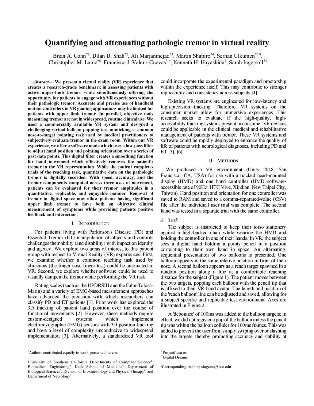 We present a virtual reality (VR) experience that creates a research-grade benchmark in assessing patients with active upper-limb tremor, while simultaneously offering the opportunity for patients to engage with VR experiences without their pathologic tremor. Accurate and precise use of handheld motion controllers in VR gaming applications may be limited for patients with upper limb tremor. In parallel, objective tools measuring tremor are not in widespread, routine clinical use. We used a commercially available VR system and designed a challenging virtual-balloon-popping test mimicking a common nose-to-target pointing task used by medical practitioners to subjectively evaluate tremor in the exam room. Within our VR experience, we offer a software mode which uses a low-pass filter to adjust hand position and pointing orientation over a series of past data points. This digital filter creates a smoothing function for hand movement which effectively removes the patient's tremor in the VR representation. While the patient completes trials of the reaching task, quantitative data on the pathologic tremor is digitally recorded. With speed, accuracy, and the tremor components computed across three axes of movement, patients can be evaluated for their tremor amplitudes in a quantitative, replicable, and enjoyable manner. Removal of tremor in digital space may allow patients having significant upper limb tremor to have both an objective clinical measurement of symptoms while providing patients positive feedback and interaction.