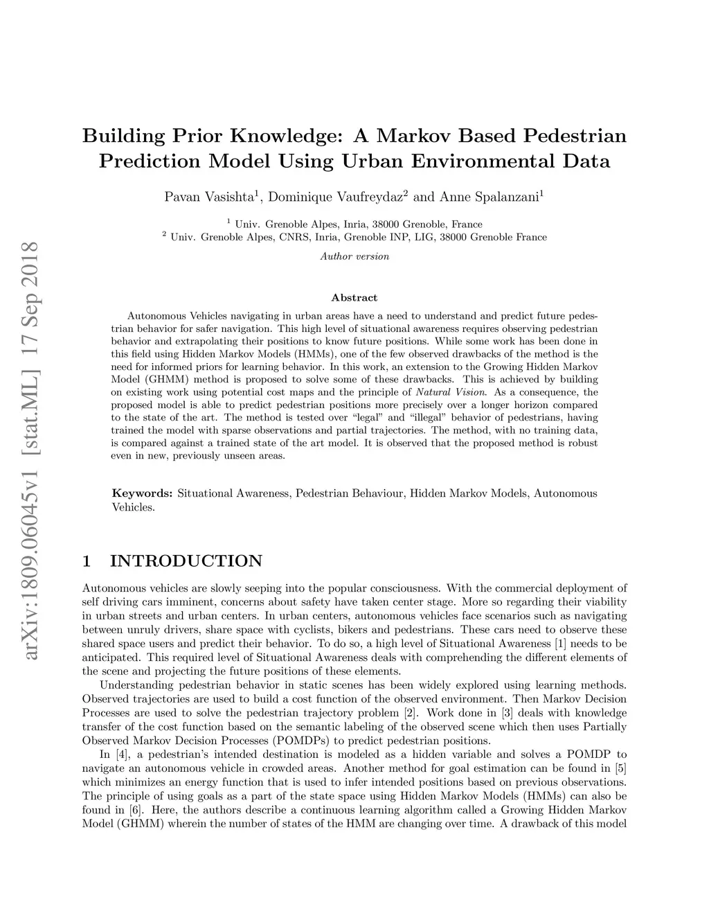 Autonomous Vehicles navigating in urban areas have a need to understand and predict future pedestrian behavior for safer navigation. This high level of situational awareness requires observing pedestrian behavior and extrapolating their positions to know future positions. While some work has been done in this field using Hidden Markov Models (HMMs), one of the few observed drawbacks of the method is the need for informed priors for learning behavior. In this work, an extension to the Growing Hidden Markov Model (GHMM) method is proposed to solve some of these drawbacks. This is achieved by building on existing work using potential cost maps and the principle of Natural Vision. As a consequence, the proposed model is able to predict pedestrian positions more precisely over a longer horizon compared to the state of the art. The method is tested over "legal" and "illegal" behavior of pedestrians, having trained the model with sparse observations and partial trajectories. The method, with no training data, is compared against a trained state of the art model. It is observed that the proposed method is robust even in new, previously unseen areas.