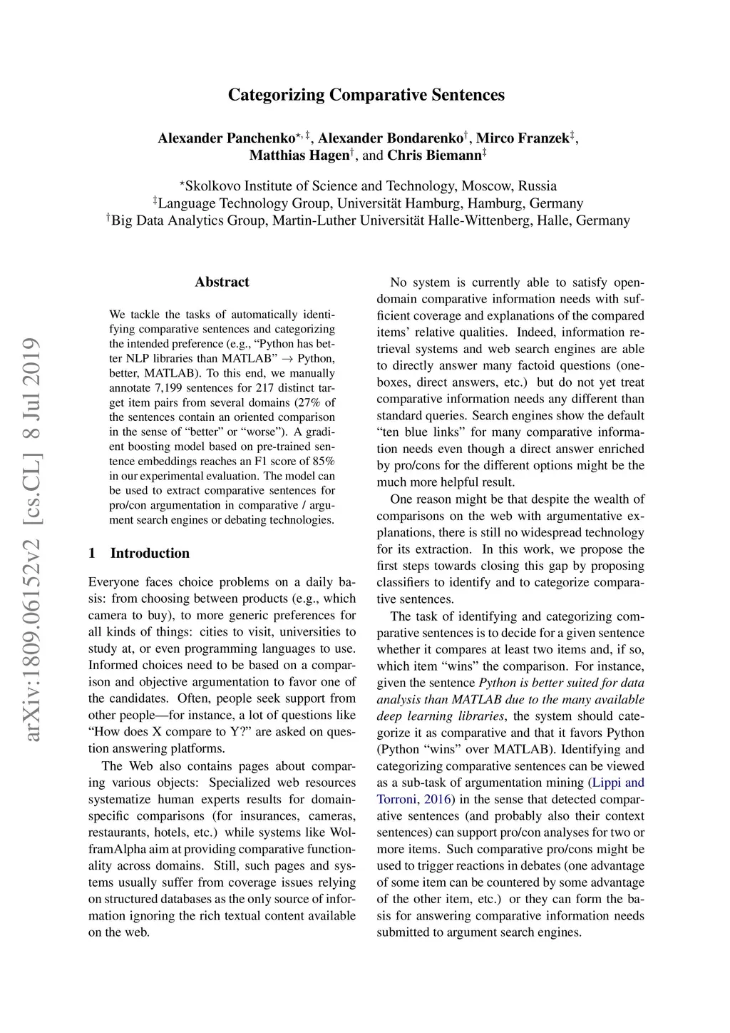 We tackle the tasks of automatically identifying comparative sentences and categorizing the intended preference (e.g., "Python has better NLP libraries than MATLAB" => (Python, better, MATLAB). To this end, we manually annotate 7,199 sentences for 217 distinct target item pairs from several domains (27% of the sentences contain an oriented comparison in the sense of "better" or "worse"). A gradient boosting model based on pre-trained sentence embeddings reaches an F1 score of 85% in our experimental evaluation. The model can be used to extract comparative sentences for pro/con argumentation in comparative / argument search engines or debating technologies.
