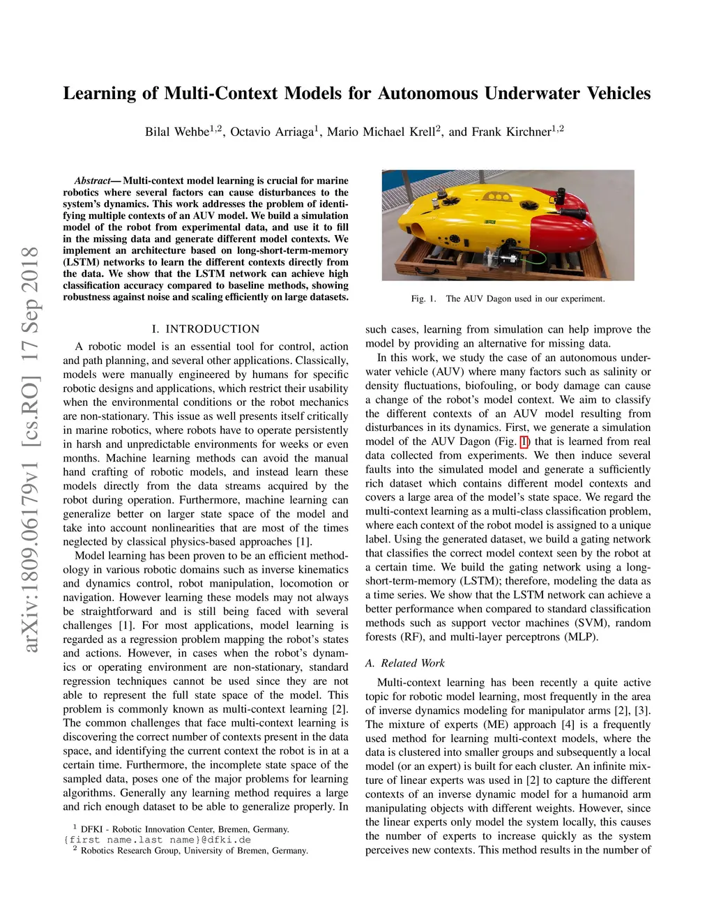 Multi-context model learning is crucial for marine robotics where several factors can cause disturbances to the system's dynamics. This work addresses the problem of identifying multiple contexts of an AUV model. We build a simulation model of the robot from experimental data, and use it to fill in the missing data and generate different model contexts. We implement an architecture based on long-short-term-memory (LSTM) networks to learn the different contexts directly from the data. We show that the LSTM network can achieve high classification accuracy compared to baseline methods, showing robustness against noise and scaling efficiently on large datasets.