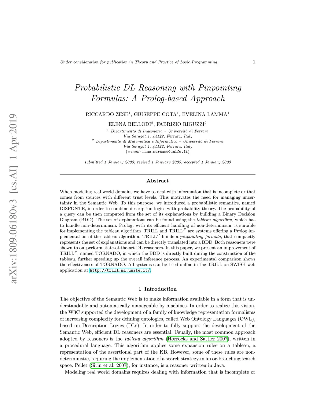 When modeling real world domains we have to deal with information that is incomplete or that comes from sources with different trust levels. This motivates the need for managing uncertainty in the Semantic Web. To this purpose, we introduced a probabilistic semantics, named DISPONTE, in order to combine description logics with probability theory. The probability of a query can be then computed from the set of its explanations by building a Binary Decision Diagram (BDD). The set of explanations can be found using the tableau algorithm, which has to handle non-determinism. Prolog, with its efficient handling of non-determinism, is suitable for implementing the tableau algorithm. TRILL and TRILLP are systems offering a Prolog implementation of the tableau algorithm. TRILLP builds a pinpointing formula, that compactly represents the set of explanations and can be directly translated into a BDD. Both reasoners were shown to outperform state-of-the-art DL reasoners. In this paper, we present an improvement of TRILLP, named TORNADO, in which the BDD is directly built during the construction of the tableau, further speeding up the overall inference process. An experimental comparison shows the effectiveness of TORNADO. All systems can be tried online in the TRILL on SWISH web application at http://trill.ml.unife.it/.