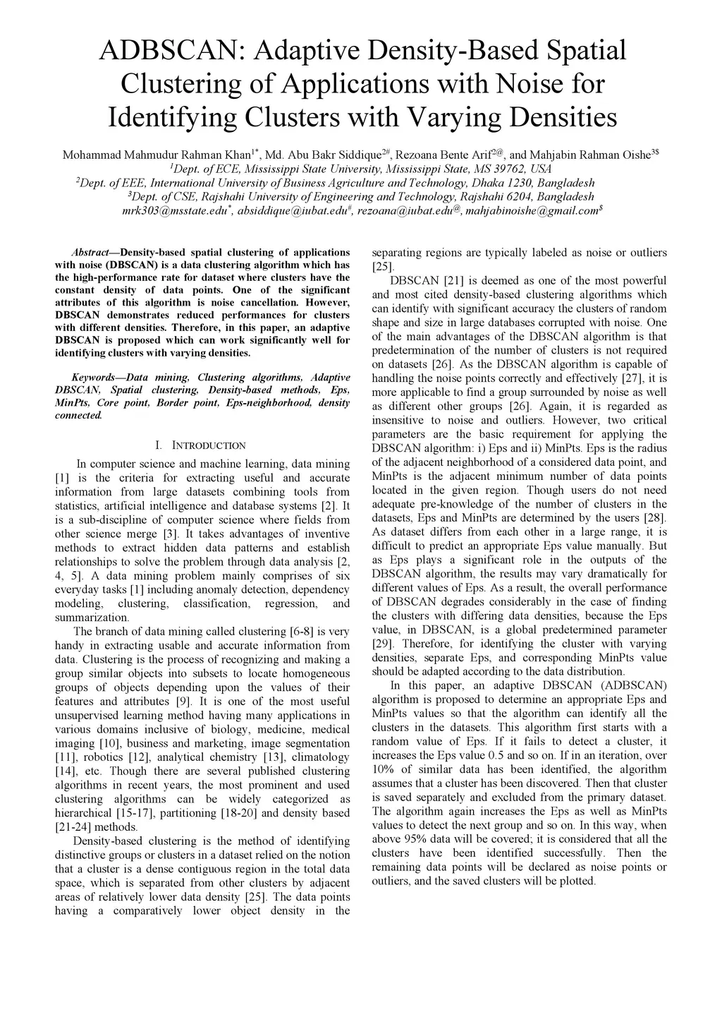 Density-based spatial clustering of applications with noise (DBSCAN) is a data clustering algorithm which has the high-performance rate for dataset where clusters have the constant density of data points. One of the significant attributes of this algorithm is noise cancellation. However, DBSCAN demonstrates reduced performances for clusters with different densities. Therefore, in this paper, an adaptive DBSCAN is proposed which can work significantly well for identifying clusters with varying densities.