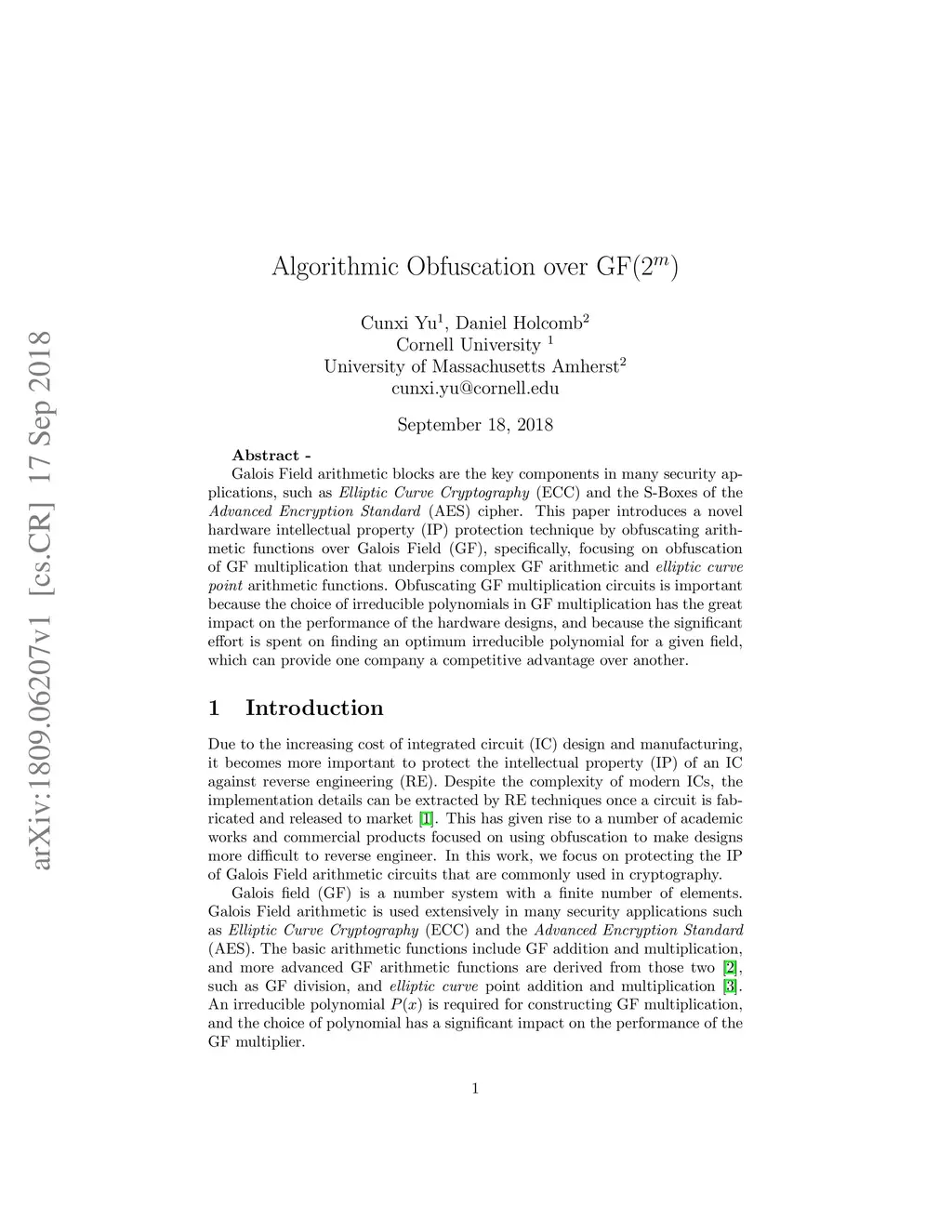 Galois Field arithmetic blocks are the key components in many security applications, such as Elliptic Curve Cryptography (ECC) and the S-Boxes of the Advanced Encryption Standard (AES) cipher. This paper introduces a novel hardware intellectual property (IP) protection technique by obfuscating arithmetic functions over Galois Field (GF), specifically, focusing on obfuscation of GF multiplication that underpins complex GF arithmetic and elliptic curve point arithmetic functions. Obfuscating GF multiplication circuits is important because the choice of irreducible polynomials in GF multiplication has the great impact on the performance of the hardware designs, and because the significant effort is spent on finding an optimum irreducible polynomial for a given field, which can provide one company a competitive advantage over another.