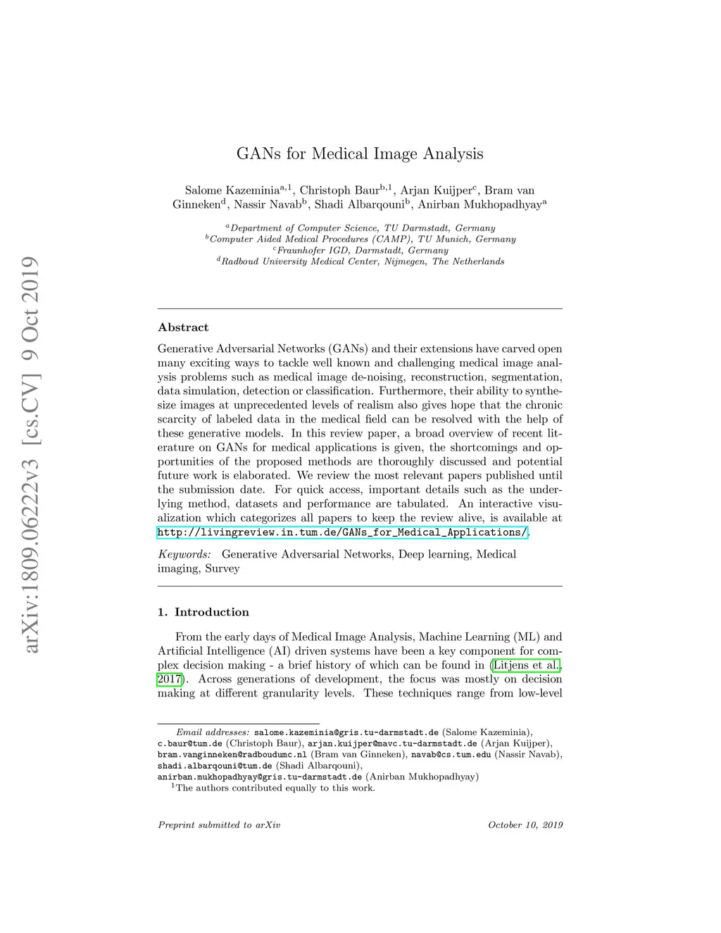 Generative Adversarial Networks (GANs) and their extensions have carved open many exciting ways to tackle well known and challenging medical image analysis problems such as medical image de-noising, reconstruction, segmentation, data simulation, detection or classification. Furthermore, their ability to synthesize images at unprecedented levels of realism also gives hope that the chronic scarcity of labeled data in the medical field can be resolved with the help of these generative models. In this review paper, a broad overview of recent literature on GANs for medical applications is given, the shortcomings and opportunities of the proposed methods are thoroughly discussed and potential future work is elaborated. We review the most relevant papers published until the submission date. For quick access, important details such as the underlying method, datasets and performance are tabulated. An interactive visualization which categorizes all papers to keep the review alive, is available at http://livingreview.in.tum.de/GANs_for_Medical_Applications.