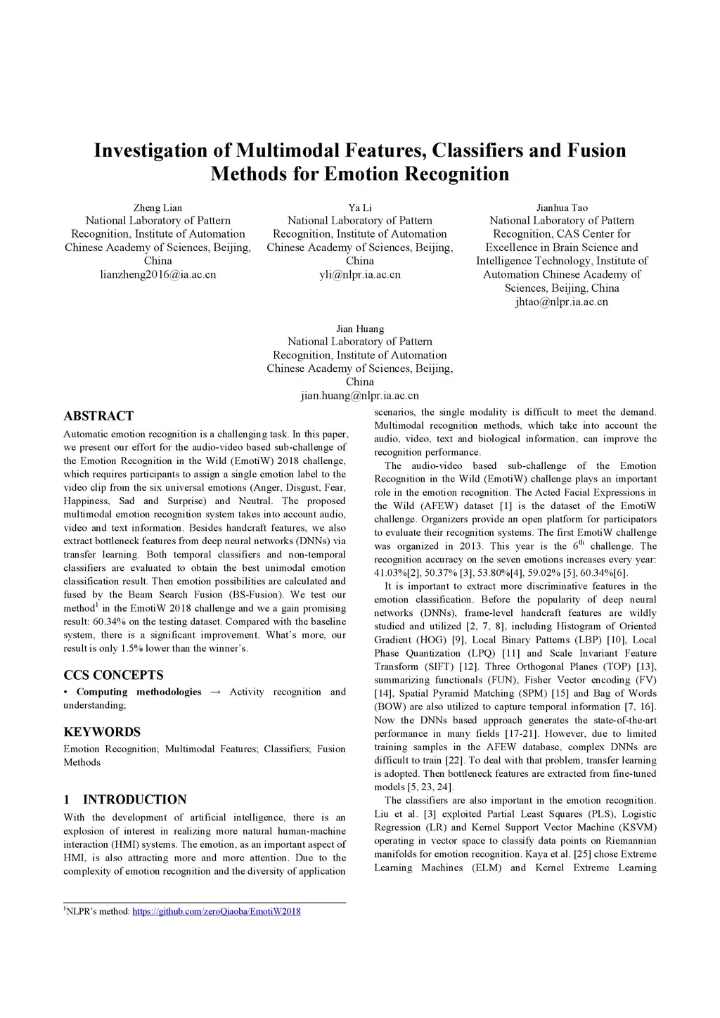 Automatic emotion recognition is a challenging task. In this paper, we present our effort for the audio-video based sub-challenge of the Emotion Recognition in the Wild (EmotiW) 2018 challenge, which requires participants to assign a single emotion label to the video clip from the six universal emotions (Anger, Disgust, Fear, Happiness, Sad and Surprise) and Neutral. The proposed multimodal emotion recognition system takes audio, video and text information into account. Except for handcraft features, we also extract bottleneck features from deep neutral networks (DNNs) via transfer learning. Both temporal classifiers and non-temporal classifiers are evaluated to obtain the best unimodal emotion classification result. Then possibilities are extracted and passed into the Beam Search Fusion (BS-Fusion). We test our method in the EmotiW 2018 challenge and we gain promising results. Compared with the baseline system, there is a significant improvement. We achieve 60.34% accuracy on the testing dataset, which is only 1.5% lower than the winner. It shows that our method is very competitive.