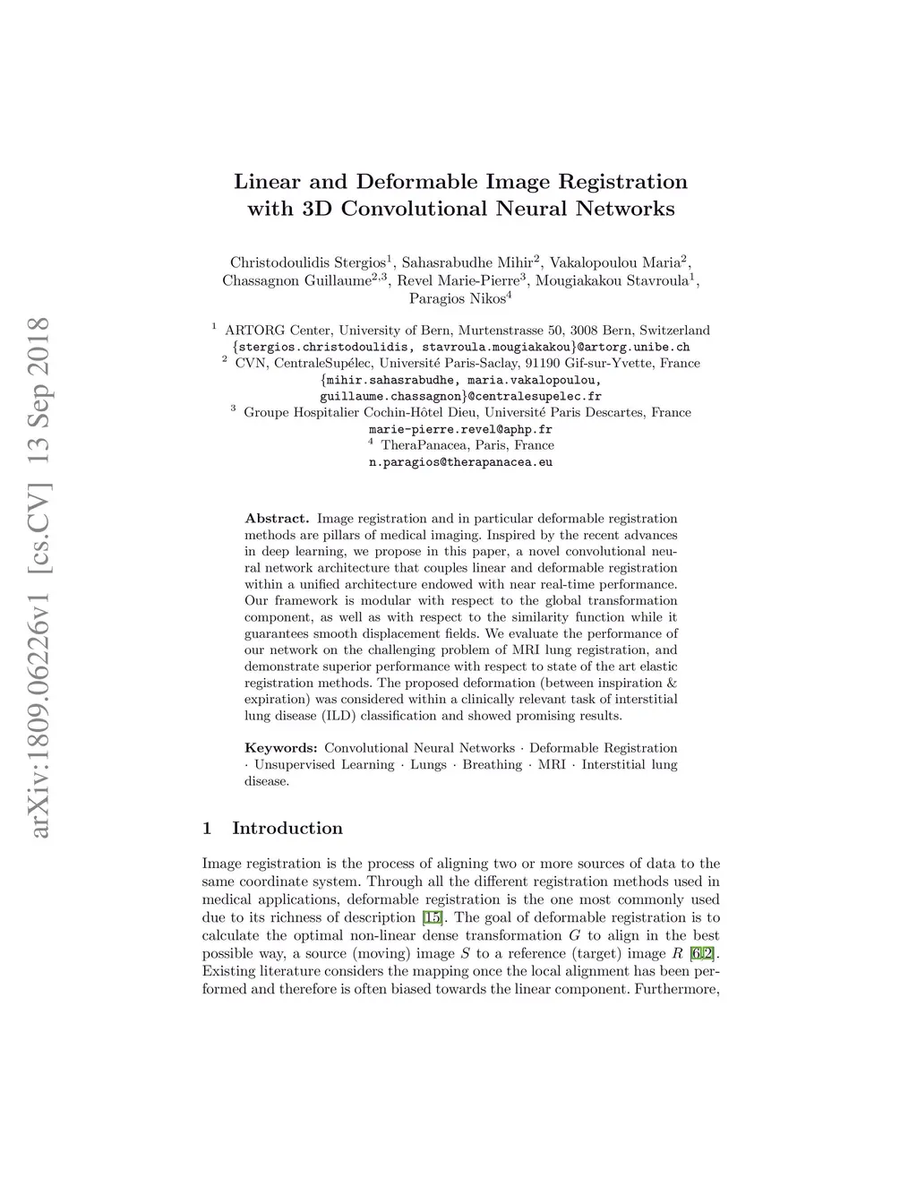 Image registration and in particular deformable registration methods are pillars of medical imaging. Inspired by the recent advances in deep learning, we propose in this paper, a novel convolutional neural network architecture that couples linear and deformable registration within a unified architecture endowed with near real-time performance. Our framework is modular with respect to the global transformation component, as well as with respect to the similarity function while it guarantees smooth displacement fields. We evaluate the performance of our network on the challenging problem of MRI lung registration, and demonstrate superior performance with respect to state of the art elastic registration methods. The proposed deformation (between inspiration & expiration) was considered within a clinically relevant task of interstitial lung disease (ILD) classification and showed promising results.