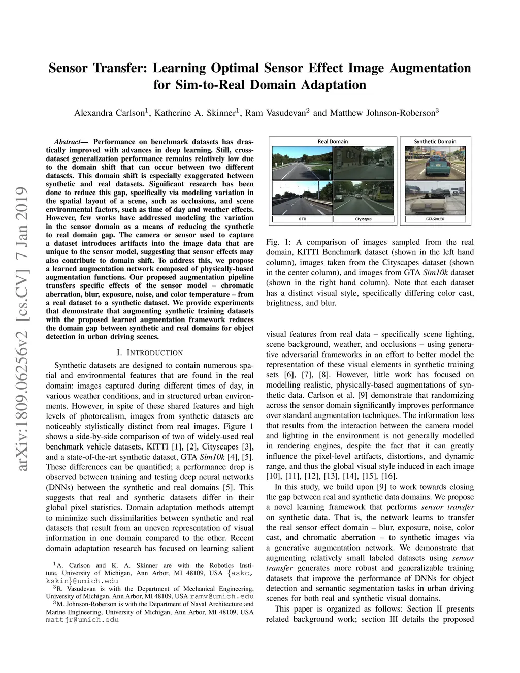 Performance on benchmark datasets has drastically improved with advances in deep learning. Still, cross-dataset generalization performance remains relatively low due to the domain shift that can occur between two different datasets. This domain shift is especially exaggerated between synthetic and real datasets. Significant research has been done to reduce this gap, specifically via modeling variation in the spatial layout of a scene, such as occlusions, and scene environmental factors, such as time of day and weather effects. However, few works have addressed modeling the variation in the sensor domain as a means of reducing the synthetic to real domain gap. The camera or sensor used to capture a dataset introduces artifacts into the image data that are unique to the sensor model, suggesting that sensor effects may also contribute to domain shift. To address this, we propose a learned augmentation network composed of physically-based augmentation functions. Our proposed augmentation pipeline transfers specific effects of the sensor model -- chromatic aberration, blur, exposure, noise, and color temperature -- from a real dataset to a synthetic dataset. We provide experiments that demonstrate that augmenting synthetic training datasets with the proposed learned augmentation framework reduces the domain gap between synthetic and real domains for object detection in urban driving scenes.