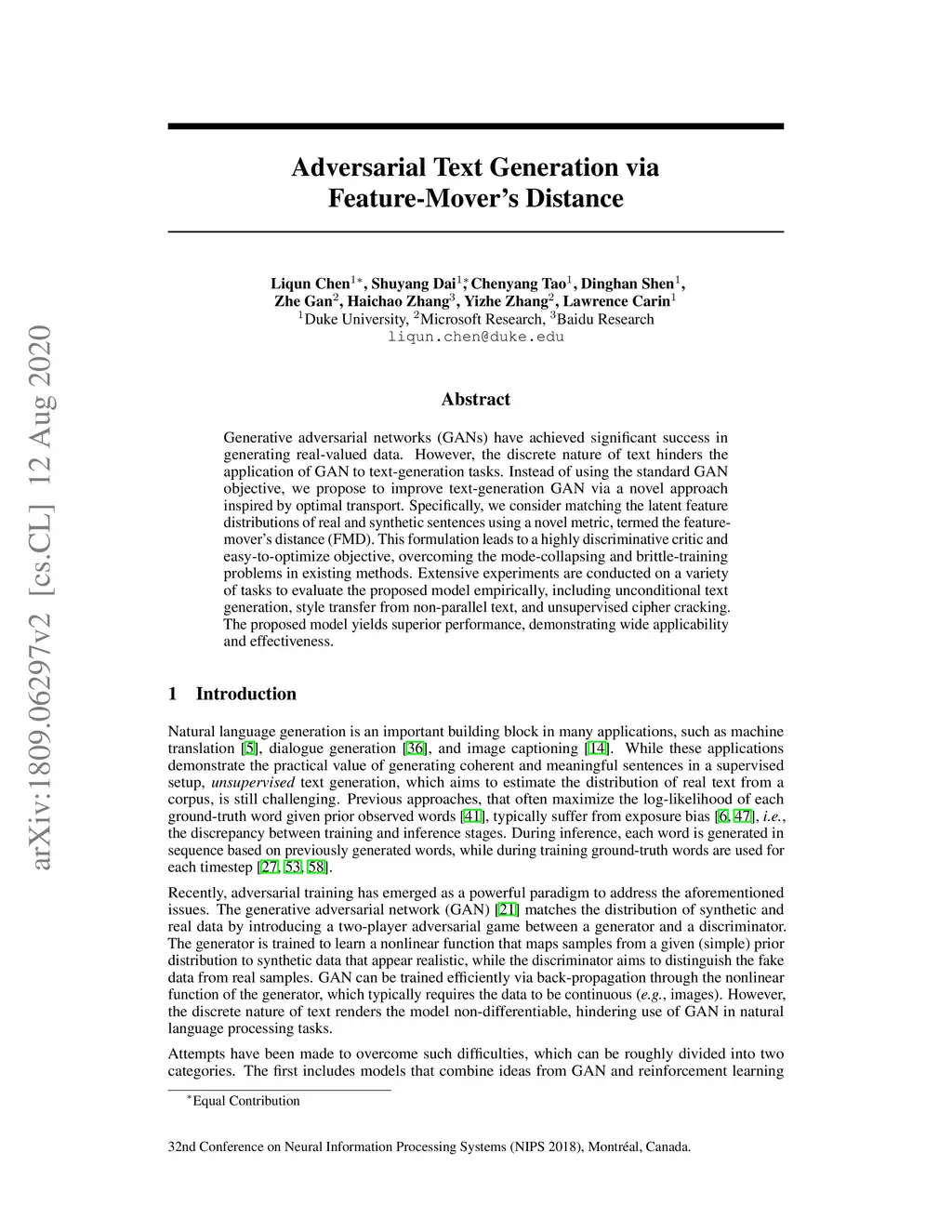 Generative adversarial networks (GANs) have achieved significant success in generating real-valued data. However, the discrete nature of text hinders the application of GAN to text-generation tasks. Instead of using the standard GAN objective, we propose to improve text-generation GAN via a novel approach inspired by optimal transport. Specifically, we consider matching the latent feature distributions of real and synthetic sentences using a novel metric, termed the feature-mover's distance (FMD). This formulation leads to a highly discriminative critic and easy-to-optimize objective, overcoming the mode-collapsing and brittle-training problems in existing methods. Extensive experiments are conducted on a variety of tasks to evaluate the proposed model empirically, including unconditional text generation, style transfer from non-parallel text, and unsupervised cipher cracking. The proposed model yields superior performance, demonstrating wide applicability and effectiveness.