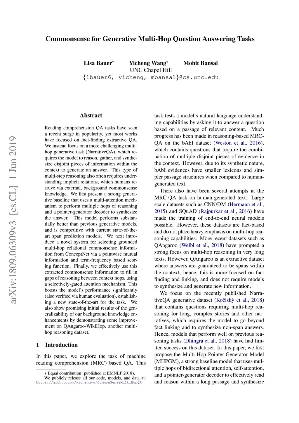 Commonsense for Generative Multi-Hop Question Answering Tasks