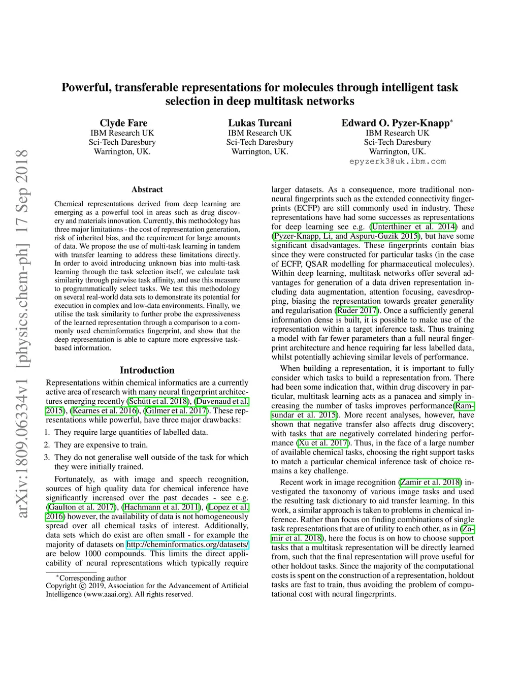 Chemical representations derived from deep learning are emerging as a powerful tool in areas such as drug discovery and materials innovation. Currently, this methodology has three major limitations - the cost of representation generation, risk of inherited bias, and the requirement for large amounts of data. We propose the use of multi-task learning in tandem with transfer learning to address these limitations directly. In order to avoid introducing unknown bias into multi-task learning through the task selection itself, we calculate task similarity through pairwise task affinity, and use this measure to programmatically select tasks. We test this methodology on several real-world data sets to demonstrate its potential for execution in complex and low-data environments. Finally, we utilise the task similarity to further probe the expressiveness of the learned representation through a comparison to a commonly used cheminformatics fingerprint, and show that the deep representation is able to capture more expressive task-based information.