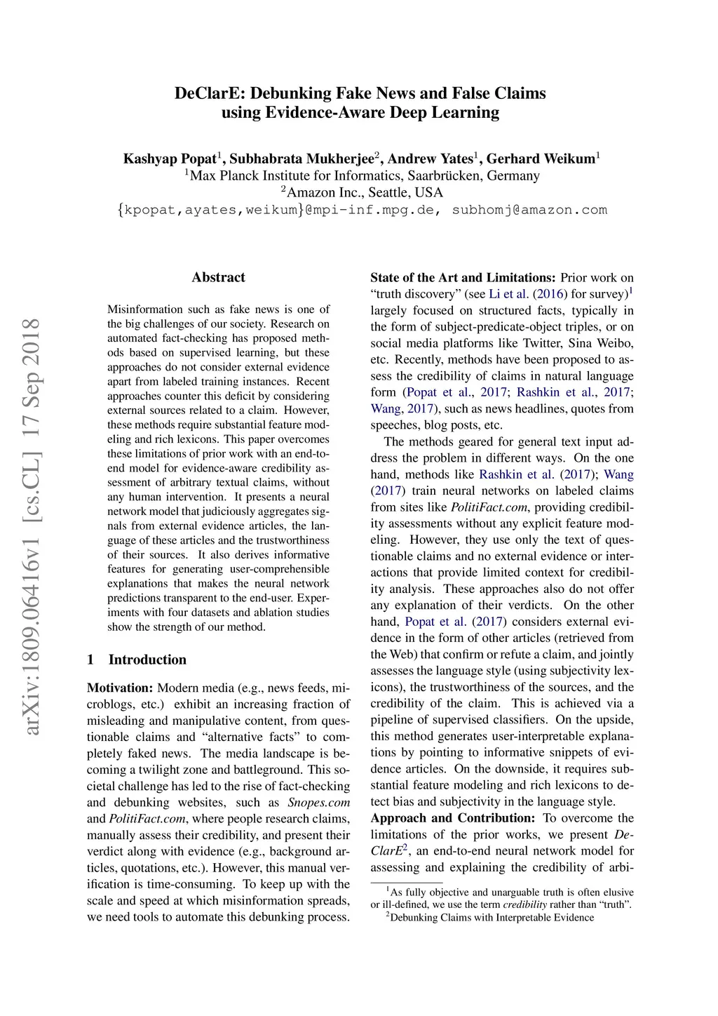 DeClarE: Debunking Fake News and False Claims using Evidence-Aware Deep
