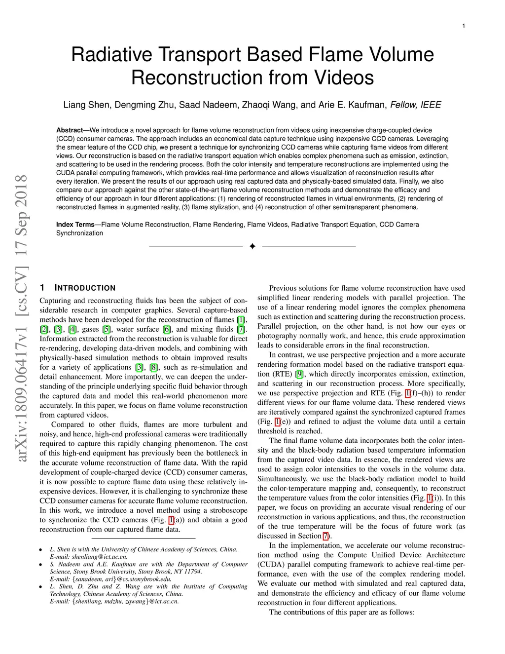 We introduce a novel approach for flame volume reconstruction from videos using inexpensive charge-coupled device (CCD) consumer cameras. The approach includes an economical data capture technique using inexpensive CCD cameras. Leveraging the smear feature of the CCD chip, we present a technique for synchronizing CCD cameras while capturing flame videos from different views. Our reconstruction is based on the radiative transport equation which enables complex phenomena such as emission, extinction, and scattering to be used in the rendering process. Both the color intensity and temperature reconstructions are implemented using the CUDA parallel computing framework, which provides real-time performance and allows visualization of reconstruction results after every iteration. We present the results of our approach using real captured data and physically-based simulated data. Finally, we also compare our approach against the other state-of-the-art flame volume reconstruction methods and demonstrate the efficacy and efficiency of our approach in four different applications: (1) rendering of reconstructed flames in virtual environments, (2) rendering of reconstructed flames in augmented reality, (3) flame stylization, and (4) reconstruction of other semitransparent phenomena.