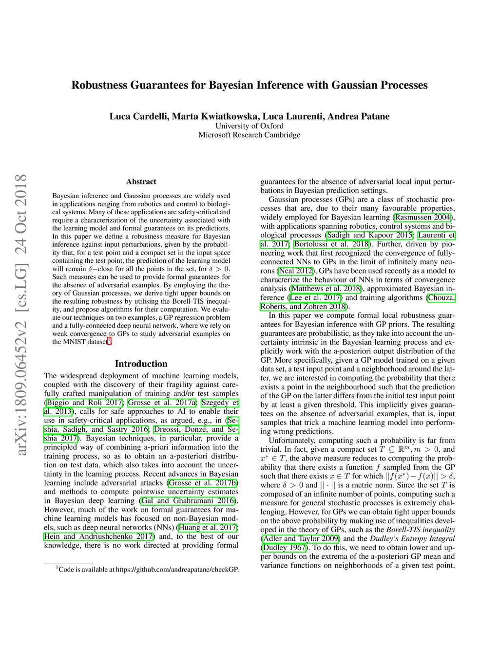 Bayesian inference and Gaussian processes are widely used in applications ranging from robotics and control to biological systems. Many of these applications are safety-critical and require a characterization of the uncertainty associated with the learning model and formal guarantees on its predictions. In this paper we define a robustness measure for Bayesian inference against input perturbations, given by the probability that, for a test point and a compact set in the input space containing the test point, the prediction of the learning model will remain close for all the points in the set, for Such measures can be used to provide formal guarantees for the absence of adversarial examples. By employing the theory of Gaussian processes, we derive tight upper bounds on the resulting robustness by utilising the Borell-TIS inequality, and propose algorithms for their computation. We evaluate our techniques on two examples, a GP regression problem and a fully-connected deep neural network, where we rely on weak convergence to GPs to study adversarial examples on the MNIST dataset.