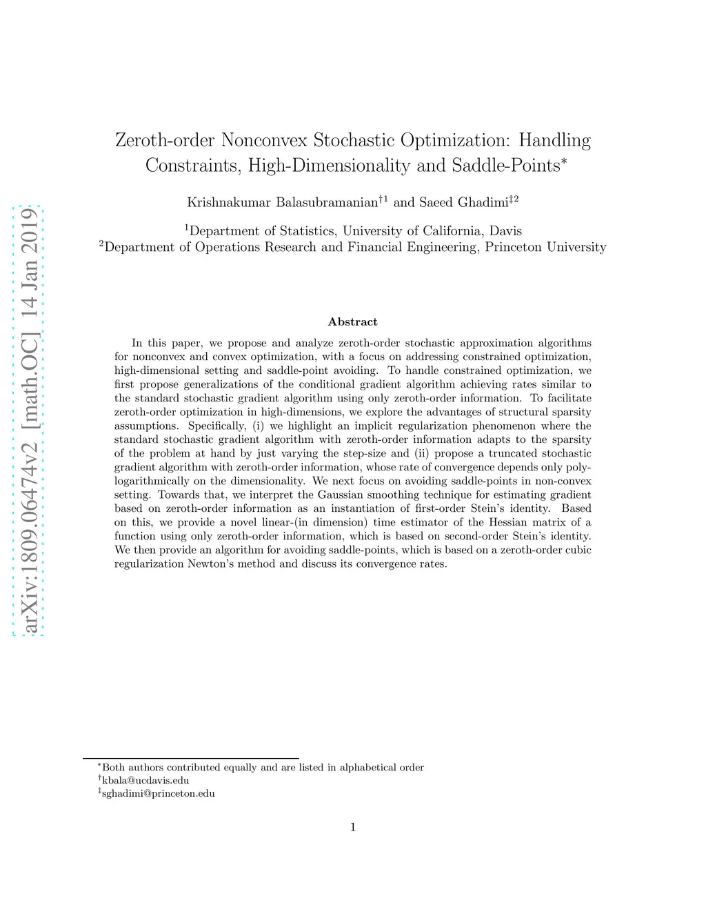 In this paper, we propose and analyze zeroth-order stochastic approximation algorithms for nonconvex and convex optimization, with a focus on addressing constrained optimization, high-dimensional setting and saddle-point avoiding. To handle constrained optimization, we first propose generalizations of the conditional gradient algorithm achieving rates similar to the standard stochastic gradient algorithm using only zeroth-order information. To facilitate zeroth-order optimization in high-dimensions, we explore the advantages of structural sparsity assumptions. Specifically, (i) we highlight an implicit regularization phenomenon where the standard stochastic gradient algorithm with zeroth-order information adapts to the sparsity of the problem at hand by just varying the step-size and (ii) propose a truncated stochastic gradient algorithm with zeroth-order information, whose rate of convergence depends only poly-logarithmically on the dimensionality. We next focus on avoiding saddle-points in non-convex setting. Towards that, we interpret the Gaussian smoothing technique for estimating gradient based on zeroth-order information as an instantiation of first-order Stein's identity. Based on this, we provide a novel linear-(in dimension) time estimator of the Hessian matrix of a function using only zeroth-order information, which is based on second-order Stein's identity. We then provide an algorithm for avoiding saddle-points, which is based on a zeroth-order cubic regularization Newton's method and discuss its convergence rates.