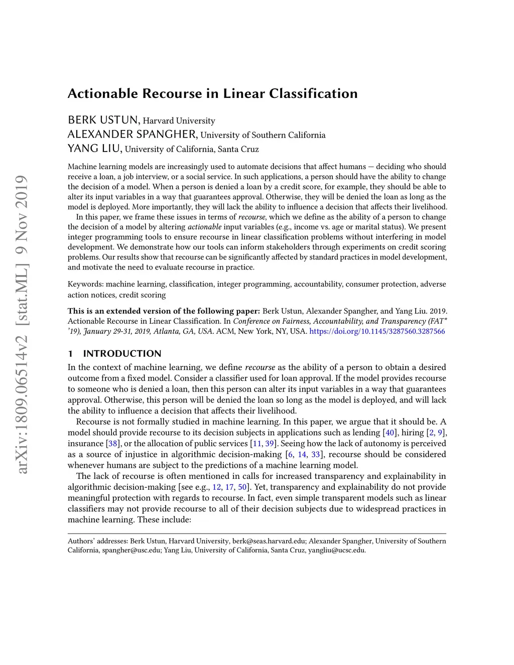 Machine learning models are increasingly used to automate decisions that affect humans - deciding who should receive a loan, a job interview, or a social service. In such applications, a person should have the ability to change the decision of a model. When a person is denied a loan by a credit score, for example, they should be able to alter its input variables in a way that guarantees approval. Otherwise, they will be denied the loan as long as the model is deployed. More importantly, they will lack the ability to influence a decision that affects their livelihood. In this paper, we frame these issues in terms of recourse, which we define as the ability of a person to change the decision of a model by altering actionable input variables (e.g., income vs. age or marital status). We present integer programming tools to ensure recourse in linear classification problems without interfering in model development. We demonstrate how our tools can inform stakeholders through experiments on credit scoring problems. Our results show that recourse can be significantly affected by standard practices in model development, and motivate the need to evaluate recourse in practice.