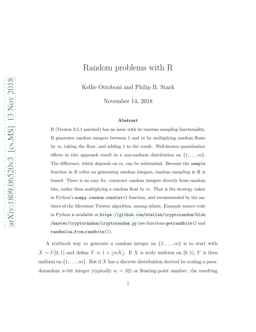 R (Version 3.5.1 patched) has an issue with its random sampling functionality. R generates random integers between and by multiplying random floats by , taking the floor, and adding to the result. Well-known quantization effects in this approach result in a non-uniform distribution on . The difference, which depends on , can be substantial. Because the sample function in R relies on generating random integers, random sampling in R is biased. There is an easy fix: construct random integers directly from random bits, rather than multiplying a random float by . That is the strategy taken in Python's numpy.random.randint() function, among others. Example source code in Python is available at https://github.com/statlab/cryptorandom/blob/master/cryptorandom/cryptorandom.py (see functions getrandbits() and randbelow_from_randbits()).