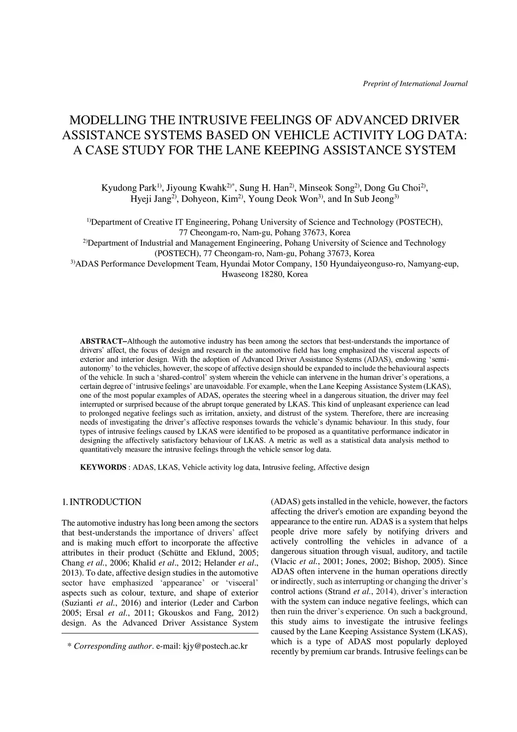 Although the automotive industry has been among the sectors that best-understands the importance of drivers' affect, the focus of design and research in the automotive field has long emphasized the visceral aspects of exterior and interior design. With the adoption of Advanced Driver Assistance Systems (ADAS), endowing 'semi-autonomy' to the vehicles, however, the scope of affective design should be expanded to include the behavioural aspects of the vehicle. In such a 'shared-control' system wherein the vehicle can intervene in the human driver's operations, a certain degree of íntrusive feelings' are unavoidable. For example, when the Lane Keeping Assistance System (LKAS), one of the most popular examples of ADAS, operates the steering wheel in a dangerous situation, the driver may feel interrupted or surprised because of the abrupt torque generated by LKAS. This kind of unpleasant experience can lead to prolonged negative feelings such as irritation, anxiety, and distrust of the system. Therefore, there are increasing needs of investigating the driver's affective responses towards the vehicle's dynamic behaviour. In this study, four types of intrusive feelings caused by LKAS were identified to be proposed as a quantitative performance indicator in designing the affectively satisfactory behaviour of LKAS. A metric as well as a statistical data analysis method to quantitatively measure the intrusive feelings through the vehicle sensor log data.