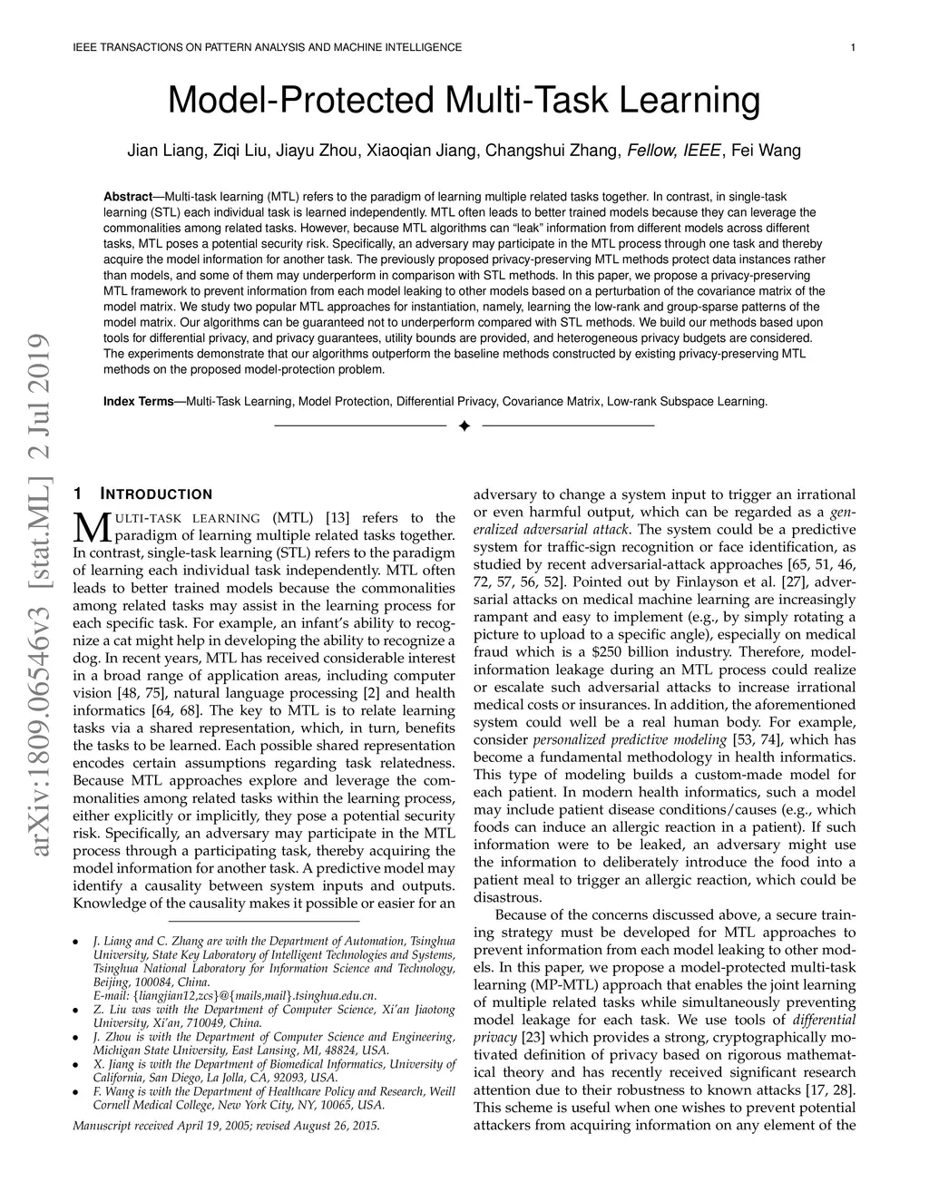 Multi-task learning (MTL) refers to the paradigm of learning multiple related tasks together. In contrast, in single-task learning (STL) each individual task is learned independently. MTL often leads to better trained models because they can leverage the commonalities among related tasks. However, because MTL algorithms can ``leak" information from different models across different tasks, MTL poses a potential security risk. Specifically, an adversary may participate in the MTL process through one task and thereby acquire the model information for another task. The previously proposed privacy-preserving MTL methods protect data instances rather than models, and some of them may underperform in comparison with STL methods. In this paper, we propose a privacy-preserving MTL framework to prevent information from each model leaking to other models based on a perturbation of the covariance matrix of the model matrix. We study two popular MTL approaches for instantiation, namely, learning the low-rank and group-sparse patterns of the model matrix. Our algorithms can be guaranteed not to underperform compared with STL methods. We build our methods based upon tools for differential privacy, and privacy guarantees, utility bounds are provided, and heterogeneous privacy budgets are considered. The experiments demonstrate that our algorithms outperform the baseline methods constructed by existing privacy-preserving MTL methods on the proposed model-protection problem.