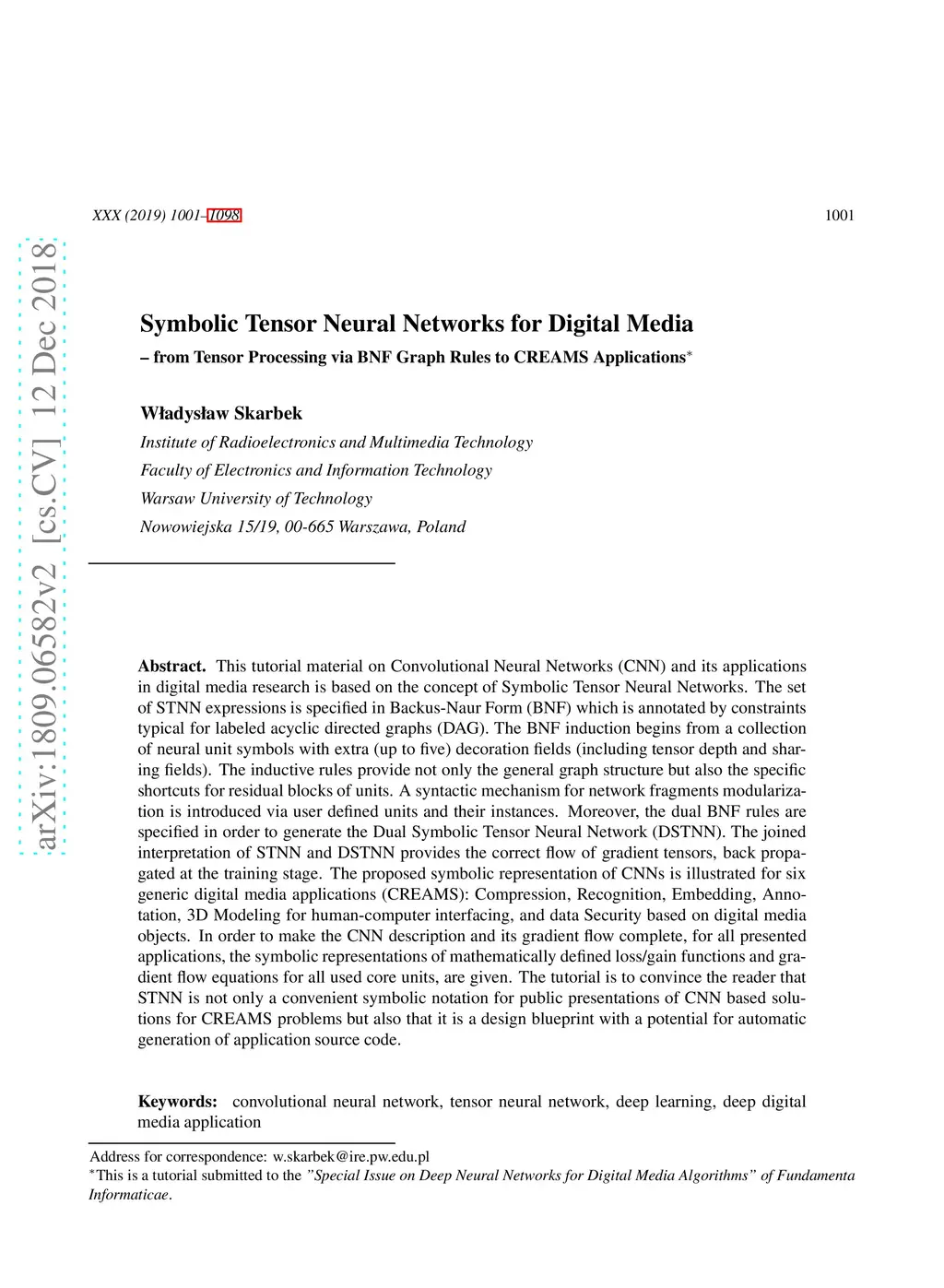 This tutorial material on Convolutional Neural Networks (CNN) and its applications in digital media research is based on the concept of Symbolic Tensor Neural Networks. The set of STNN expressions is specified in Backus-Naur Form (BNF) which is annotated by constraints typical for labeled acyclic directed graphs (DAG). The BNF induction begins from a collection of neural unit symbols with extra (up to five) decoration fields (including tensor depth and sharing fields). The inductive rules provide not only the general graph structure but also the specific shortcuts for residual blocks of units. A syntactic mechanism for network fragments modularization is introduced via user defined units and their instances. Moreover, the dual BNF rules are specified in order to generate the Dual Symbolic Tensor Neural Network (DSTNN). The joined interpretation of STNN and DSTNN provides the correct flow of gradient tensors, back propagated at the training stage. The proposed symbolic representation of CNNs is illustrated for six generic digital media applications (CREAMS): Compression, Recognition, Embedding, Annotation, 3D Modeling for human-computer interfacing, and data Security based on digital media objects. In order to make the CNN description and its gradient flow complete, for all presented applications, the symbolic representations of mathematically defined loss/gain functions and gradient flow equations for all used core units, are given. The tutorial is to convince the reader that STNN is not only a convenient symbolic notation for public presentations of CNN based solutions for CREAMS problems but also that it is a design blueprint with a potential for automatic generation of application source code.