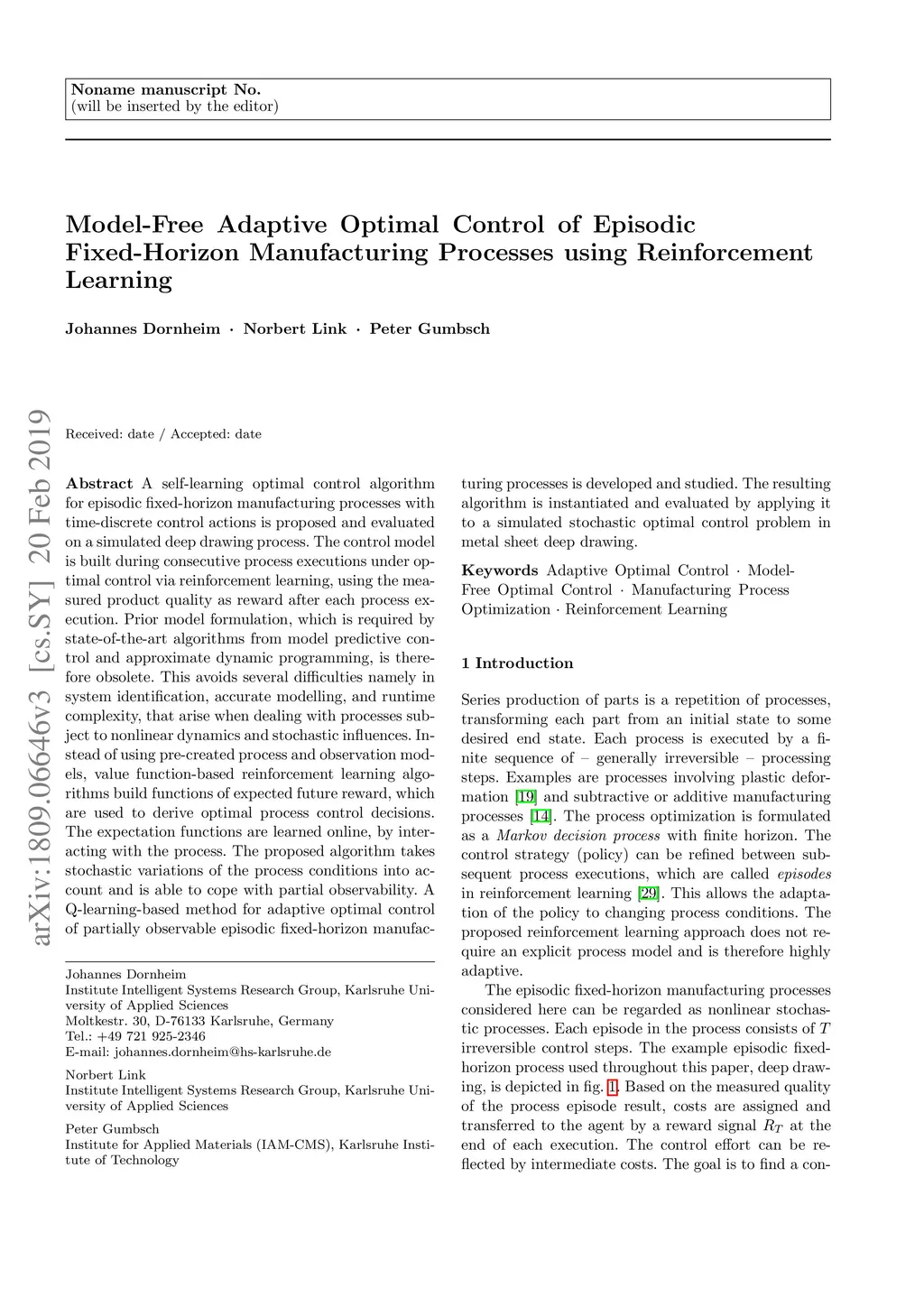 A self-learning optimal control algorithm for episodic fixed-horizon manufacturing processes with time-discrete control actions is proposed and evaluated on a simulated deep drawing process. The control model is built during consecutive process executions under optimal control via reinforcement learning, using the measured product quality as reward after each process execution. Prior model formulation, which is required by state-of-the-art algorithms from model predictive control and approximate dynamic programming, is therefore obsolete. This avoids several difficulties namely in system identification, accurate modelling, and runtime complexity, that arise when dealing with processes subject to nonlinear dynamics and stochastic influences. Instead of using pre-created process and observation models, value function-based reinforcement learning algorithms build functions of expected future reward, which are used to derive optimal process control decisions. The expectation functions are learned online, by interacting with the process. The proposed algorithm takes stochastic variations of the process conditions into account and is able to cope with partial observability. A Q-learning-based method for adaptive optimal control of partially observable episodic fixed-horizon manufacturing processes is developed and studied. The resulting algorithm is instantiated and evaluated by applying it to a simulated stochastic optimal control problem in metal sheet deep drawing.