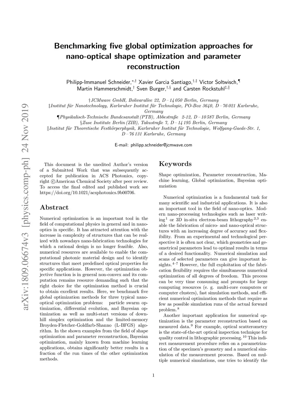 Numerical optimization is an important tool in the field of computational physics in general and in nano-optics in specific. It has attracted attention with the increase in complexity of structures that can be realized with nowadays nano-fabrication technologies for which a rational design is no longer feasible. Also, numerical resources are available to enable the computational photonic material design and to identify structures that meet predefined optical properties for specific applications. However, the optimization objective function is in general non-convex and its computation remains resource demanding such that the right choice for the optimization method is crucial to obtain excellent results. Here, we benchmark five global optimization methods for three typical nano-optical optimization problems: \removed{downhill simplex optimization, the limited-memory Broyden-Fletcher-Goldfarb-Shanno (L-BFGS) algorithm, particle swarm optimization, differential evolution, and Bayesian optimization} \added{particle swarm optimization, differential evolution, and Bayesian optimization as well as multi-start versions of downhill simplex optimization and the limited-memory Broyden-Fletcher-Goldfarb-Shanno (L-BFGS) algorithm}. In the shown examples from the field of shape optimization and parameter reconstruction, Bayesian optimization, mainly known from machine learning applications, obtains significantly better results in a fraction of the run times of the other optimization methods.