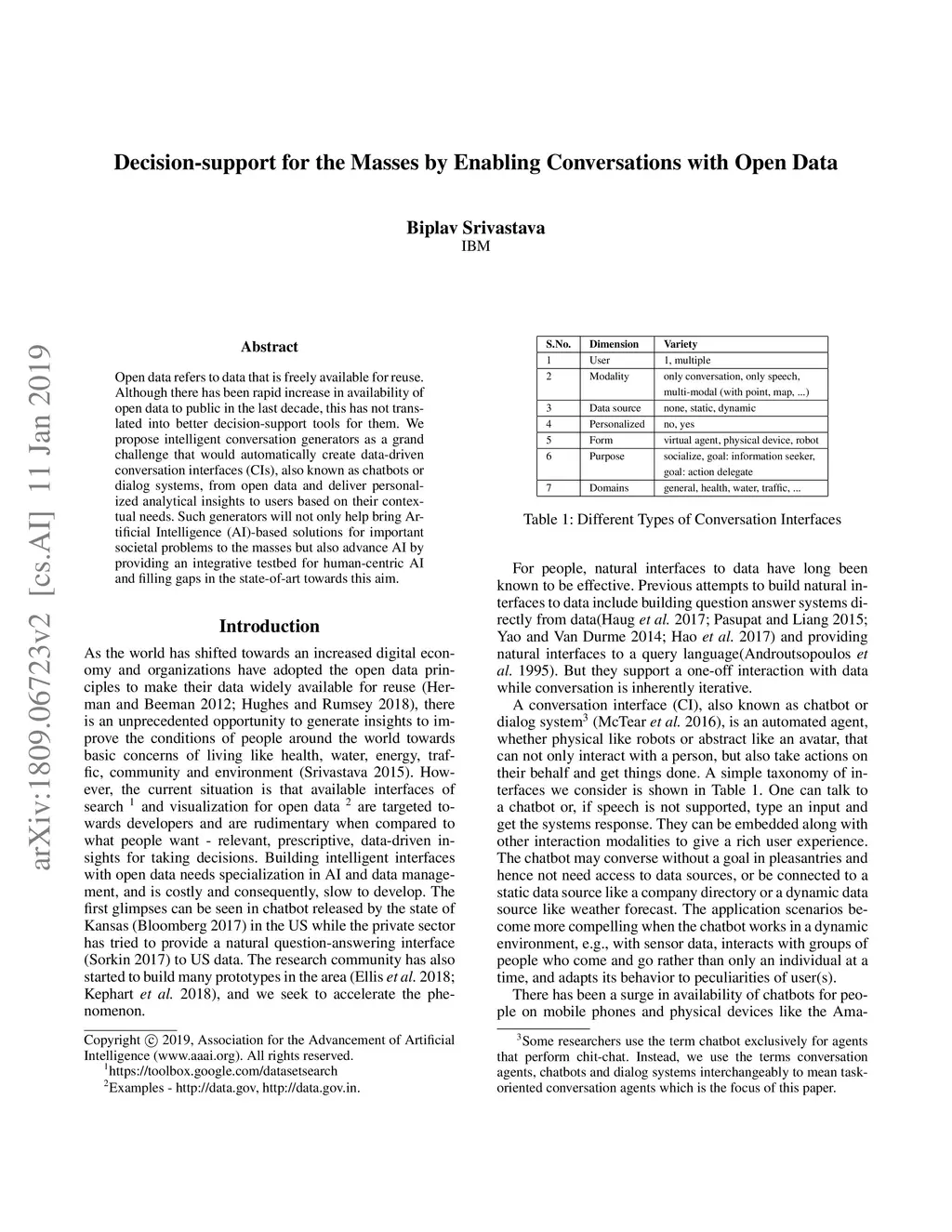 Open data refers to data that is freely available for reuse. Although there has been rapid increase in availability of open data to public in the last decade, this has not translated into better decision-support tools for them. We propose intelligent conversation generators as a grand challenge that would automatically create data-driven conversation interfaces (CIs), also known as chatbots or dialog systems, from open data and deliver personalized analytical insights to users based on their contextual needs. Such generators will not only help bring Artificial Intelligence (AI)-based solutions for important societal problems to the masses but also advance AI by providing an integrative testbed for human-centric AI and filling gaps in the state-of-art towards this aim.