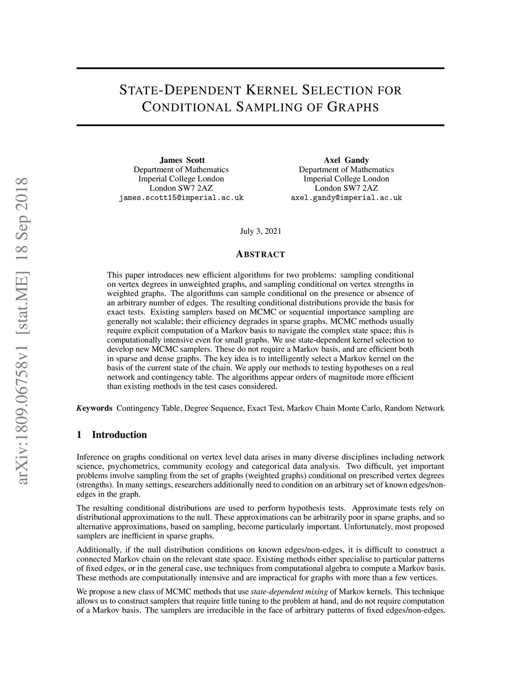 This paper introduces new efficient algorithms for two problems: sampling conditional on vertex degrees in unweighted graphs, and sampling conditional on vertex strengths in weighted graphs. The algorithms can sample conditional on the presence or absence of an arbitrary number of edges. The resulting conditional distributions provide the basis for exact tests. Existing samplers based on MCMC or sequential importance sampling are generally not scalable; their efficiency degrades in sparse graphs. MCMC methods usually require explicit computation of a Markov basis to navigate the complex state space; this is computationally intensive even for small graphs. We use state-dependent kernel selection to develop new MCMC samplers. These do not require a Markov basis, and are efficient both in sparse and dense graphs. The key idea is to intelligently select a Markov kernel on the basis of the current state of the chain. We apply our methods to testing hypotheses on a real network and contingency table. The algorithms appear orders of magnitude more efficient than existing methods in the test cases considered.
