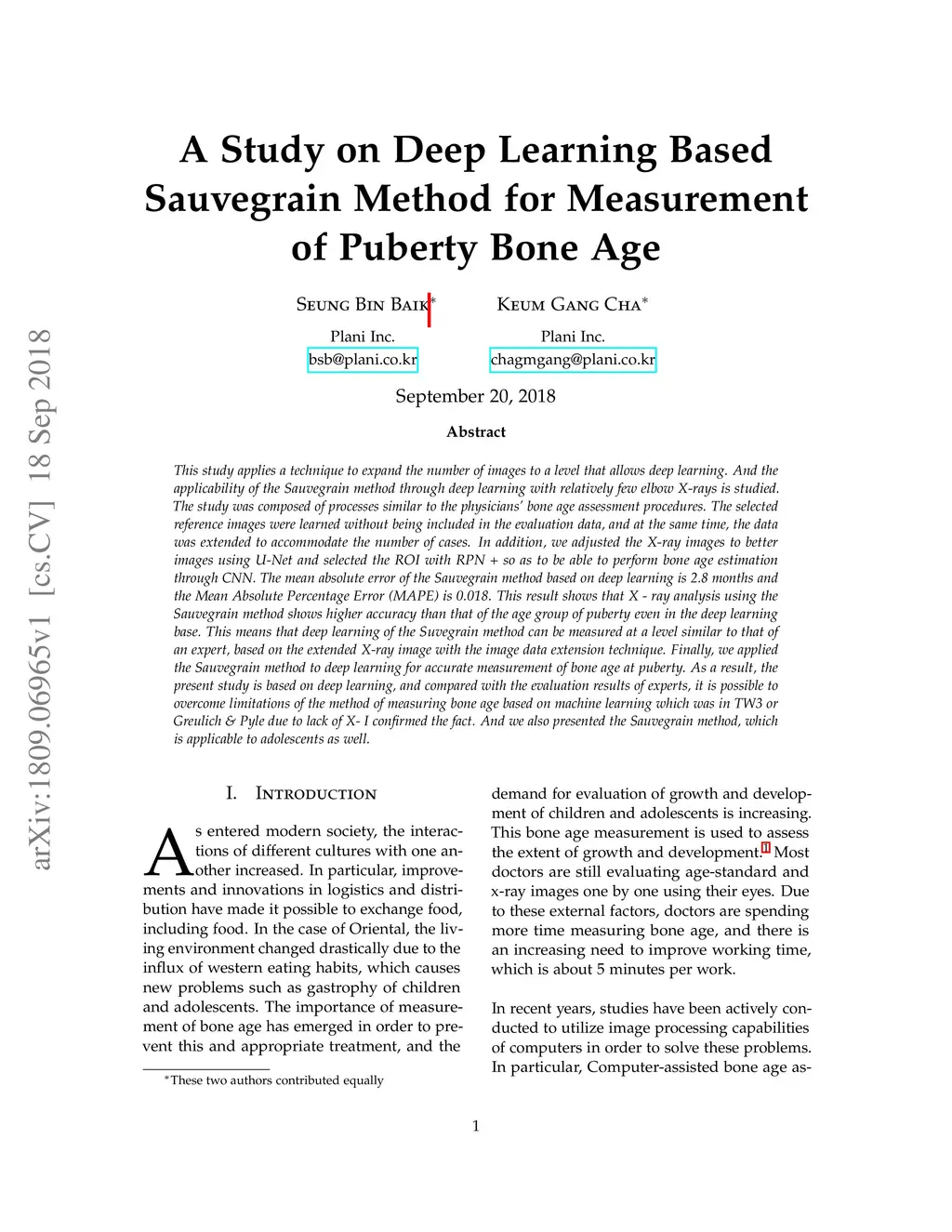 This study applies a technique to expand the number of images to a level that allows deep learning. And the applicability of the Sauvegrain method through deep learning with relatively few elbow X-rays is studied. The study was composed of processes similar to the physicians' bone age assessment procedures. The selected reference images were learned without being included in the evaluation data, and at the same time, the data was extended to accommodate the number of cases. In addition, we adjusted the X-ray images to better images using U-Net and selected the ROI with RPN + so as to be able to perform bone age estimation through CNN. The mean absolute error of the Sauvegrain method based on deep learning is 2.8 months and the Mean Absolute Percentage Error (MAPE) is 0.018. This result shows that X - ray analysis using the Sauvegrain method shows higher accuracy than that of the age group of puberty even in the deep learning base. This means that deep learning of the Suvegrain method can be measured at a level similar to that of an expert, based on the extended X-ray image with the image data extension technique. Finally, we applied the Sauvegrain method to deep learning for accurate measurement of bone age at puberty. As a result, the present study is based on deep learning, and compared with the evaluation results of experts, it is possible to overcome limitations of the method of measuring bone age based on machine learning which was in TW3 or Greulich & Pyle due to lack of X- I confirmed the fact. And we also presented the Sauvegrain method, which is applicable to adolescents as well.