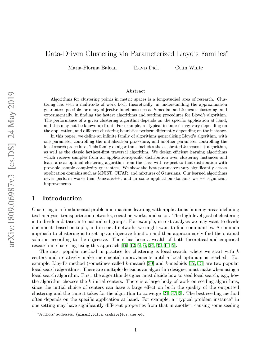 Algorithms for clustering points in metric spaces is a long-studied area of research. Clustering has seen a multitude of work both theoretically, in understanding the approximation guarantees possible for many objective functions such as k-median and k-means clustering, and experimentally, in finding the fastest algorithms and seeding procedures for Lloyd's algorithm. The performance of a given clustering algorithm depends on the specific application at hand, and this may not be known up front. For example, a "typical instance" may vary depending on the application, and different clustering heuristics perform differently depending on the instance. In this paper, we define an infinite family of algorithms generalizing Lloyd's algorithm, with one parameter controlling the initialization procedure, and another parameter controlling the local search procedure. This family of algorithms includes the celebrated k-means++ algorithm, as well as the classic farthest-first traversal algorithm. We design efficient learning algorithms which receive samples from an application-specific distribution over clustering instances and learn a near-optimal clustering algorithm from the class. We show the best parameters vary significantly across datasets such as MNIST, CIFAR, and mixtures of Gaussians. Our learned algorithms never perform worse than k-means++, and on some datasets we see significant improvements.