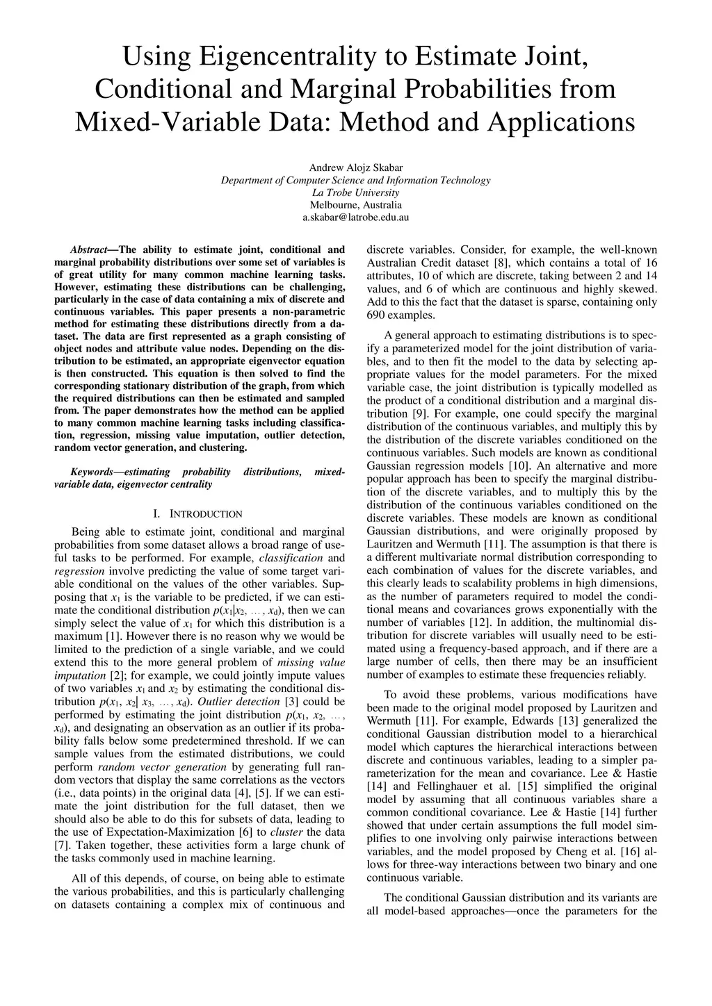 The ability to estimate joint, conditional and marginal probability distributions over some set of variables is of great utility for many common machine learning tasks. However, estimating these distributions can be challenging, particularly in the case of data containing a mix of discrete and continuous variables. This paper presents a non-parametric method for estimating these distributions directly from a dataset. The data are first represented as a graph consisting of object nodes and attribute value nodes. Depending on the distribution to be estimated, an appropriate eigenvector equation is then constructed. This equation is then solved to find the corresponding stationary distribution of the graph, from which the required distributions can then be estimated and sampled from. The paper demonstrates how the method can be applied to many common machine learning tasks including classification, regression, missing value imputation, outlier detection, random vector generation, and clustering.