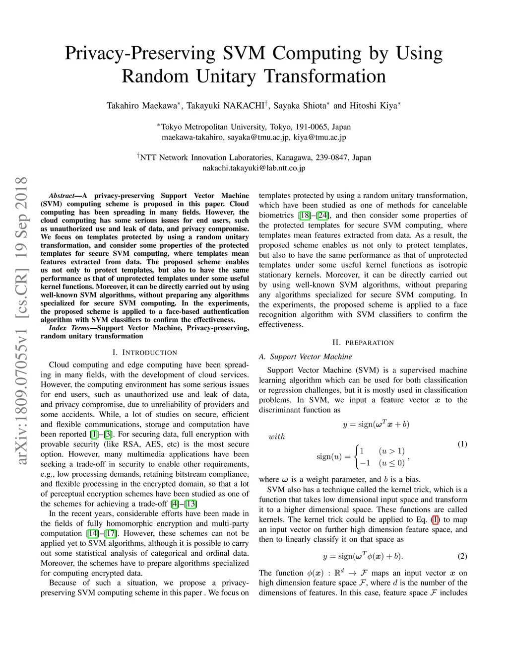 Privacy-Preserving SVM Computing by Using Random Unitary Transformation