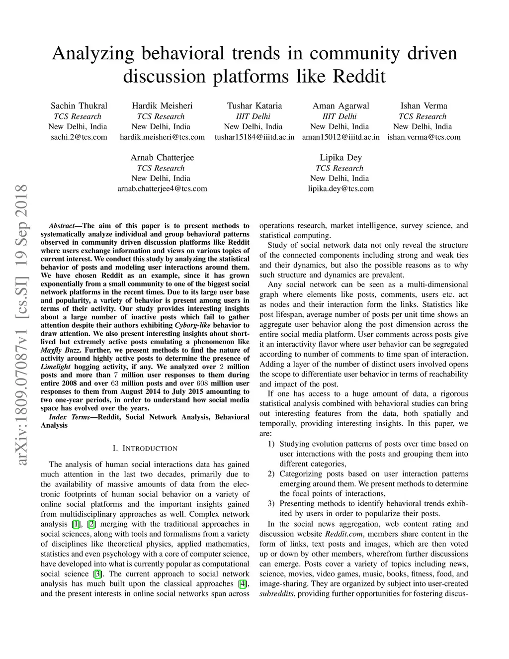 The aim of this paper is to present methods to systematically analyze individual and group behavioral patterns observed in community driven discussion platforms like Reddit where users exchange information and views on various topics of current interest. We conduct this study by analyzing the statistical behavior of posts and modeling user interactions around them. We have chosen Reddit as an example, since it has grown exponentially from a small community to one of the biggest social network platforms in the recent times. Due to its large user base and popularity, a variety of behavior is present among users in terms of their activity. Our study provides interesting insights about a large number of inactive posts which fail to gather attention despite their authors exhibiting Cyborg-like behavior to draw attention. We also present interesting insights about short-lived but extremely active posts emulating a phenomenon like Mayfly Buzz. Further, we present methods to find the nature of activity around highly active posts to determine the presence of Limelight hogging activity, if any. We analyzed over million posts and more than million user responses to them during entire 2008 and over million posts and over million user responses to them from August 2014 to July 2015 amounting to two one-year periods, in order to understand how social media space has evolved over the years.