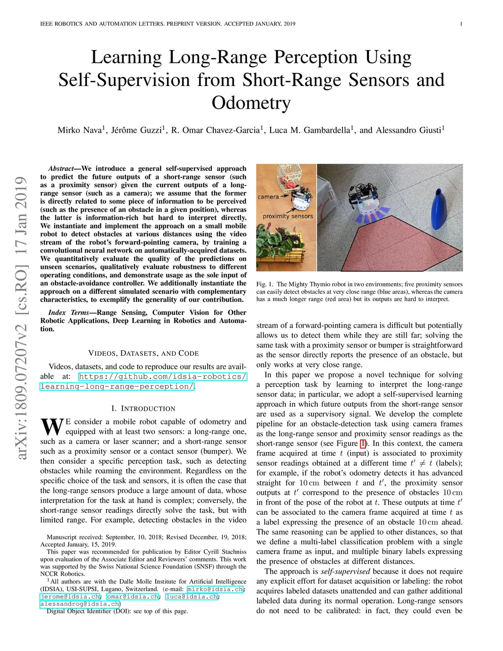 We introduce a general self-supervised approach to predict the future outputs of a short-range sensor (such as a proximity sensor) given the current outputs of a long-range sensor (such as a camera); we assume that the former is directly related to some piece of information to be perceived (such as the presence of an obstacle in a given position), whereas the latter is information-rich but hard to interpret directly. We instantiate and implement the approach on a small mobile robot to detect obstacles at various distances using the video stream of the robot's forward-pointing camera, by training a convolutional neural network on automatically-acquired datasets. We quantitatively evaluate the quality of the predictions on unseen scenarios, qualitatively evaluate robustness to different operating conditions, and demonstrate usage as the sole input of an obstacle-avoidance controller. We additionally instantiate the approach on a different simulated scenario with complementary characteristics, to exemplify the generality of our contribution.