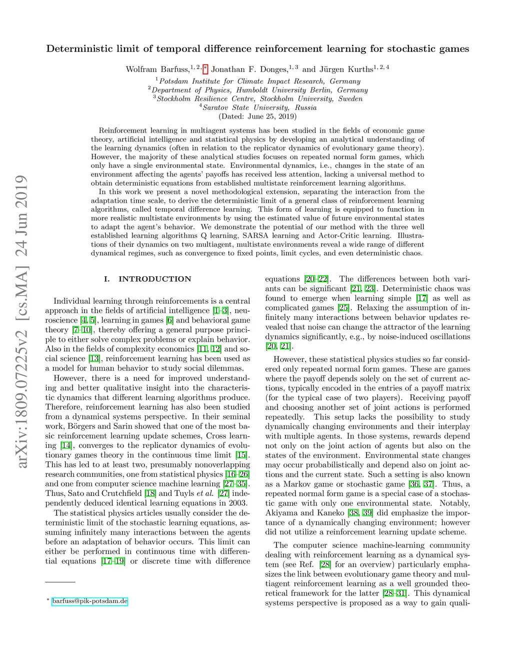 Reinforcement learning in multiagent systems has been studied in the fields of economic game theory, artificial intelligence and statistical physics by developing an analytical understanding of the learning dynamics (often in relation to the replicator dynamics of evolutionary game theory). However, the majority of these analytical studies focuses on repeated normal form games, which only have a single environmental state. Environmental dynamics, i.e., changes in the state of an environment affecting the agents' payoffs has received less attention, lacking a universal method to obtain deterministic equations from established multistate reinforcement learning algorithms. In this work we present a novel methodological extension, separating the interaction from the adaptation time scale, to derive the deterministic limit of a general class of reinforcement learning algorithms, called temporal difference learning. This form of learning is equipped to function in more realistic multistate environments by using the estimated value of future environmental states to adapt the agent's behavior. We demonstrate the potential of our method with the three well established learning algorithms Q learning, SARSA learning and Actor-Critic learning. Illustrations of their dynamics on two multiagent, multistate environments reveal a wide range of different dynamical regimes, such as convergence to fixed points, limit cycles, and even deterministic chaos.