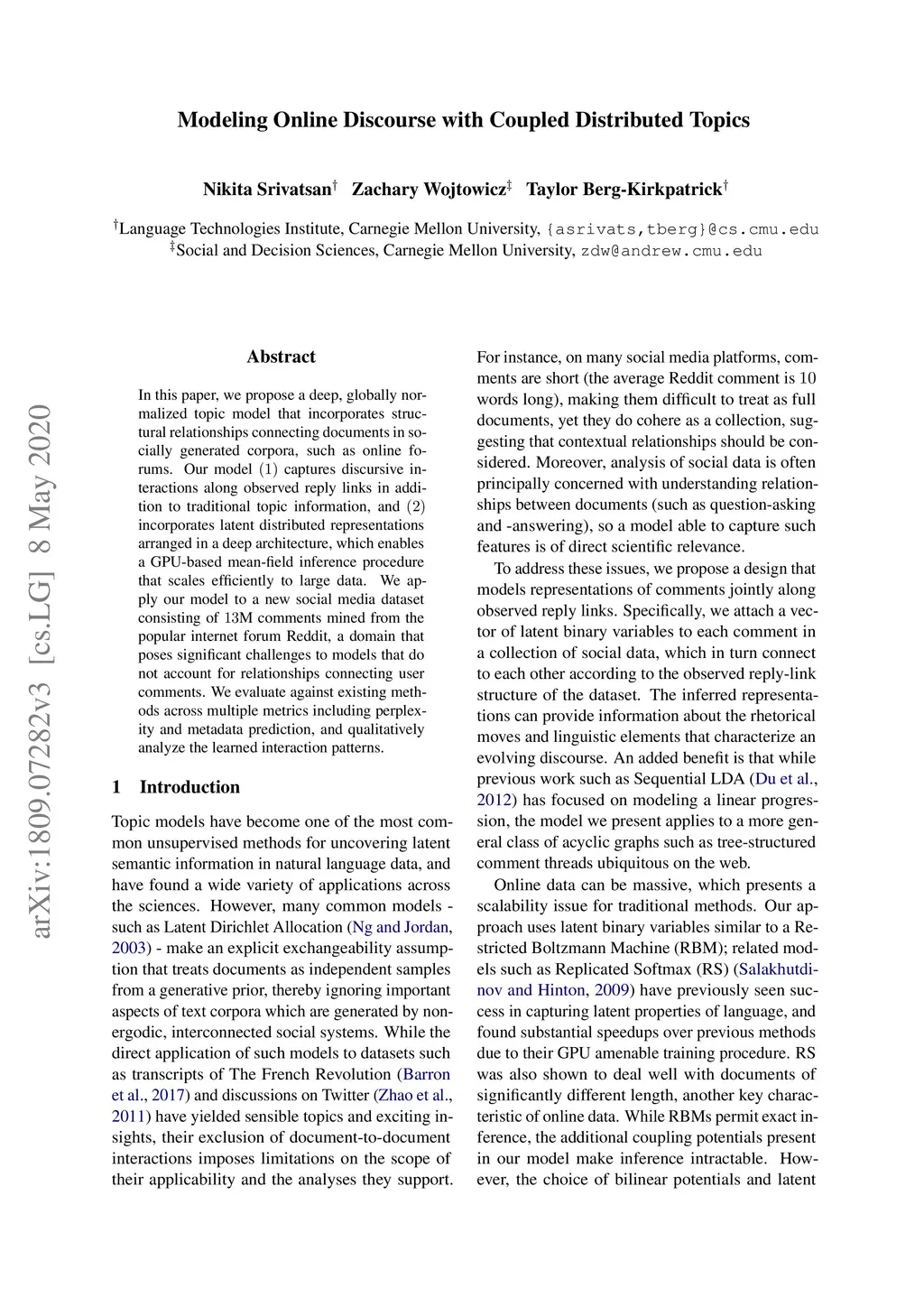 In this paper, we propose a deep, globally normalized topic model that incorporates structural relationships connecting documents in socially generated corpora, such as online forums. Our model (1) captures discursive interactions along observed reply links in addition to traditional topic information, and (2) incorporates latent distributed representations arranged in a deep architecture, which enables a GPU-based mean-field inference procedure that scales efficiently to large data. We apply our model to a new social media dataset consisting of 13M comments mined from the popular internet forum Reddit, a domain that poses significant challenges to models that do not account for relationships connecting user comments. We evaluate against existing methods across multiple metrics including perplexity and metadata prediction, and qualitatively analyze the learned interaction patterns.