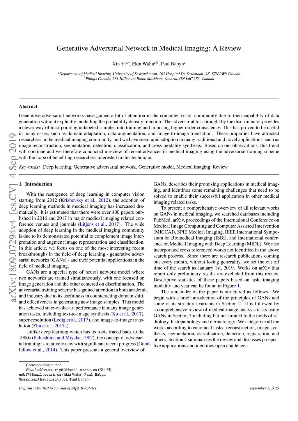 Generative adversarial networks have gained a lot of attention in the computer vision community due to their capability of data generation without explicitly modelling the probability density function. The adversarial loss brought by the discriminator provides a clever way of incorporating unlabeled samples into training and imposing higher order consistency. This has proven to be useful in many cases, such as domain adaptation, data augmentation, and image-to-image translation. These properties have attracted researchers in the medical imaging community, and we have seen rapid adoption in many traditional and novel applications, such as image reconstruction, segmentation, detection, classification, and cross-modality synthesis. Based on our observations, this trend will continue and we therefore conducted a review of recent advances in medical imaging using the adversarial training scheme with the hope of benefiting researchers interested in this technique.