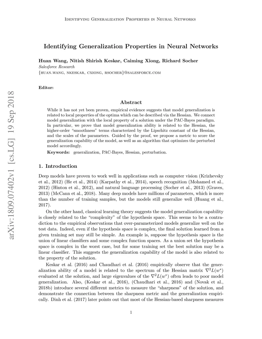 While it has not yet been proven, empirical evidence suggests that model generalization is related to local properties of the optima which can be described via the Hessian. We connect model generalization with the local property of a solution under the PAC-Bayes paradigm. In particular, we prove that model generalization ability is related to the Hessian, the higher-order "smoothness" terms characterized by the Lipschitz constant of the Hessian, and the scales of the parameters. Guided by the proof, we propose a metric to score the generalization capability of the model, as well as an algorithm that optimizes the perturbed model accordingly.
