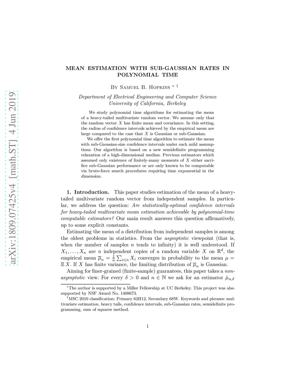 We study polynomial time algorithms for estimating the mean of a heavy-tailed multivariate random vector. We assume only that the random vector has finite mean and covariance. In this setting, the radius of confidence intervals achieved by the empirical mean are large compared to the case that is Gaussian or sub-Gaussian. We offer the first polynomial time algorithm to estimate the mean with sub-Gaussian-size confidence intervals under such mild assumptions. Our algorithm is based on a new semidefinite programming relaxation of a high-dimensional median. Previous estimators which assumed only existence of finitely-many moments of either sacrifice sub-Gaussian performance or are only known to be computable via brute-force search procedures requiring time exponential in the dimension.