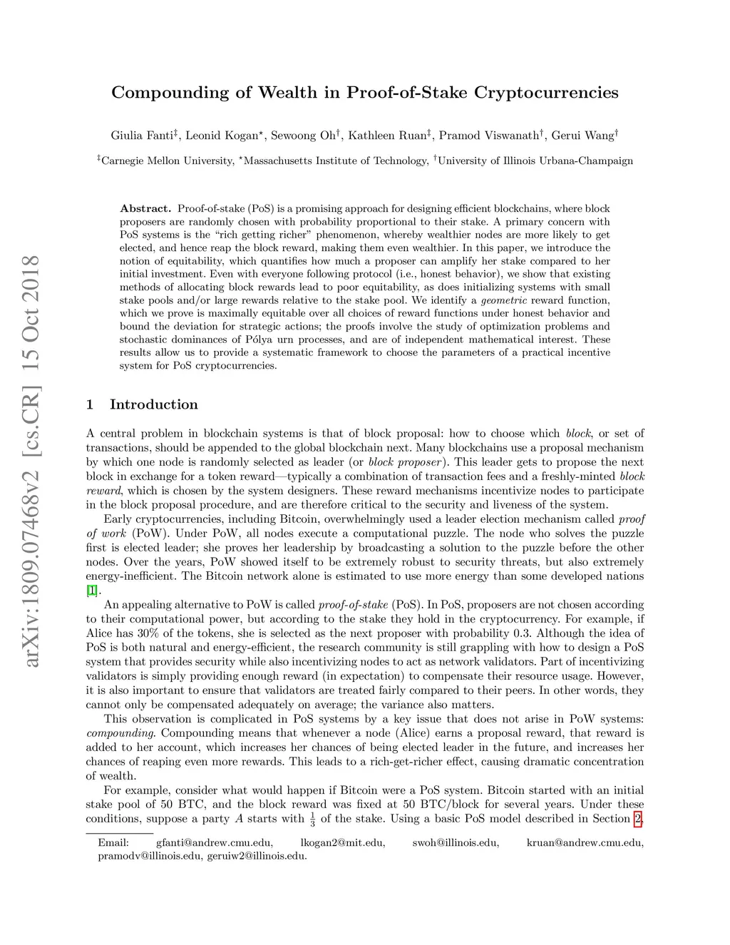 Proof-of-stake (PoS) is a promising approach for designing efficient blockchains, where block proposers are randomly chosen with probability proportional to their stake. A primary concern with PoS systems is the "rich getting richer" phenomenon, whereby wealthier nodes are more likely to get elected, and hence reap the block reward, making them even wealthier. In this paper, we introduce the notion of equitability, which quantifies how much a proposer can amplify her stake compared to her initial investment. Even with everyone following protocol (i.e., honest behavior), we show that existing methods of allocating block rewards lead to poor equitability, as does initializing systems with small stake pools and/or large rewards relative to the stake pool. We identify a \emph{geometric} reward function, which we prove is maximally equitable over all choices of reward functions under honest behavior and bound the deviation for strategic actions; the proofs involve the study of optimization problems and stochastic dominances of Polya urn processes, and are of independent mathematical interest. These results allow us to provide a systematic framework to choose the parameters of a practical incentive system for PoS cryptocurrencies.