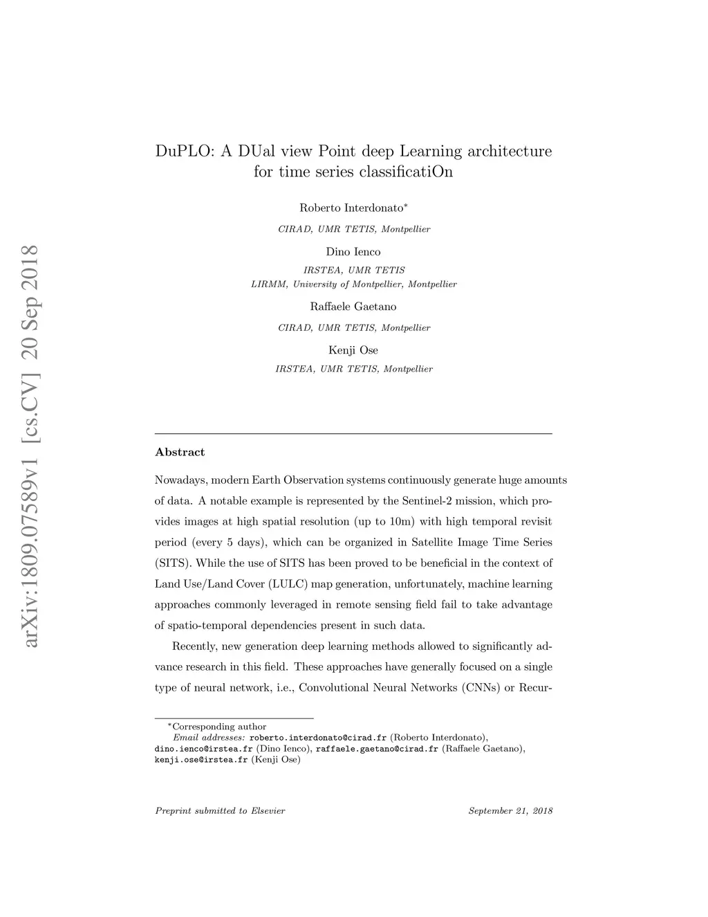 Nowadays, modern Earth Observation systems continuously generate huge amounts of data. A notable example is represented by the Sentinel-2 mission, which provides images at high spatial resolution (up to 10m) with high temporal revisit period (every 5 days), which can be organized in Satellite Image Time Series (SITS). While the use of SITS has been proved to be beneficial in the context of Land Use/Land Cover (LULC) map generation, unfortunately, machine learning approaches commonly leveraged in remote sensing field fail to take advantage of spatio-temporal dependencies present in such data. Recently, new generation deep learning methods allowed to significantly advance research in this field. These approaches have generally focused on a single type of neural network, i.e., Convolutional Neural Networks (CNNs) or Recurrent Neural Networks (RNNs), which model different but complementary information: spatial autocorrelation (CNNs) and temporal dependencies (RNNs). In this work, we propose the first deep learning architecture for the analysis of SITS data, namely \method{} (DUal view Point deep Learning architecture for time series classificatiOn), that combines Convolutional and Recurrent neural networks to exploit their complementarity. Our hypothesis is that, since CNNs and RNNs capture different aspects of the data, a combination of both models would produce a more diverse and complete representation of the information for the underlying land cover classification task. Experiments carried out on two study sites characterized by different land cover characteristics (i.e., the \textit{Gard} site in France and the \textit{Reunion Island} in the Indian Ocean), demonstrate the significance of our proposal.