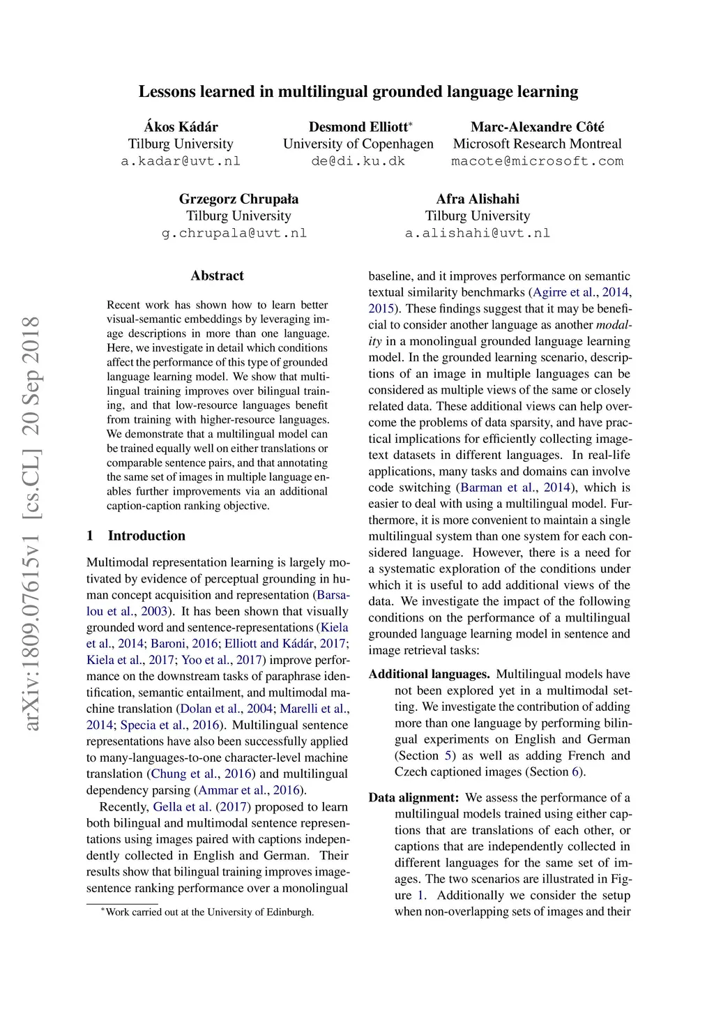 Lessons learned in multilingual grounded language learning