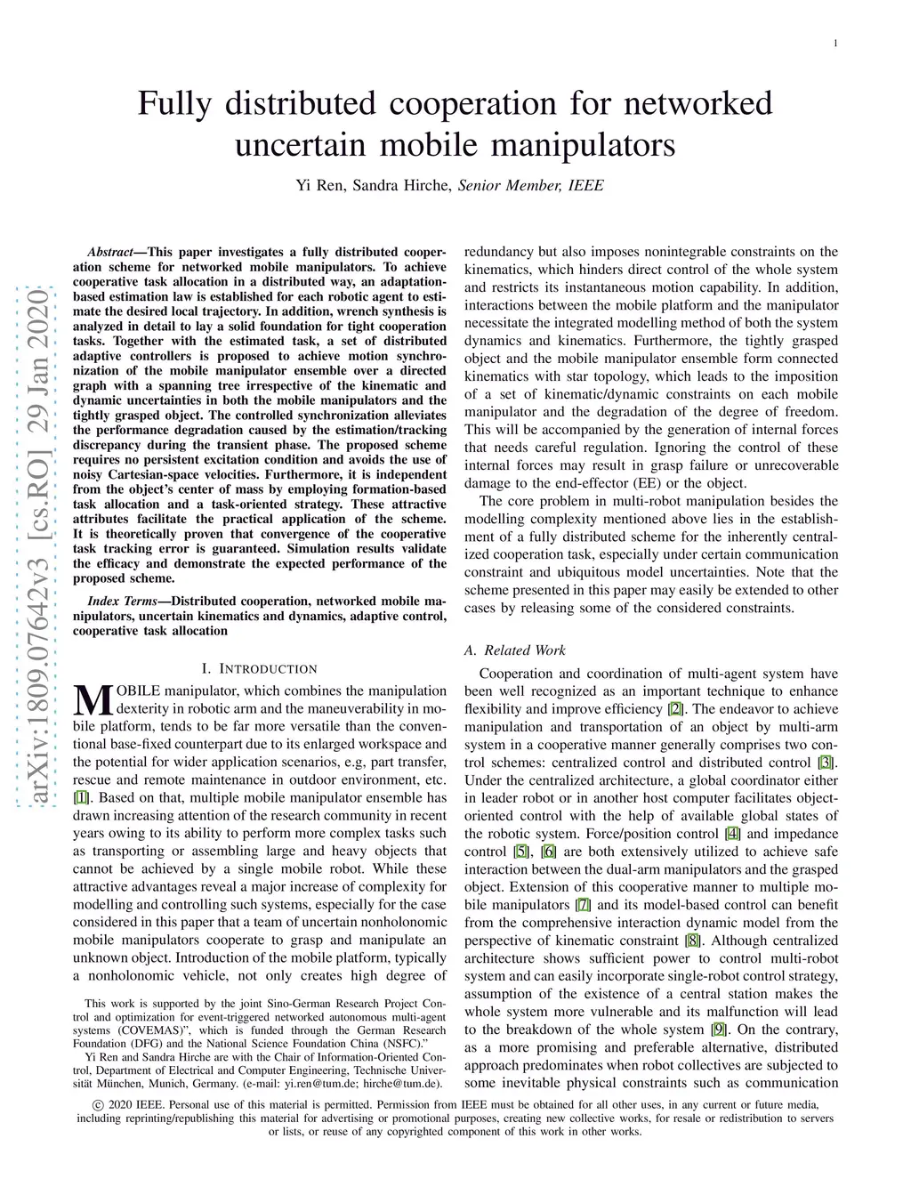 This paper investigates a fully distributed cooperation scheme for networked mobile manipulators. To achieve cooperative task allocation in a distributed way, an adaptation-based estimation law is established for each robotic agent to estimate the desired local trajectory. In addition, wrench synthesis is analyzed in detail to lay a solid foundation for tight cooperation tasks. Together with the estimated task, a set of distributed adaptive controllers is proposed to achieve motion synchronization of the mobile manipulator ensemble over a directed graph with a spanning tree irrespective of the kinematic and dynamic uncertainties in both the mobile manipulators and the tightly grasped object. The controlled synchronization alleviates the performance degradation caused by the estimation/tracking discrepancy during the transient phase. The proposed scheme requires no persistent excitation condition and avoids the use of noisy Cartesian-space velocities. Furthermore, it is independent from the object's center of mass by employing formation-based task allocation and a task-oriented strategy. These attractive attributes facilitate the practical application of the scheme. It is theoretically proven that convergence of the cooperative task tracking error is guaranteed. Simulation results validate the efficacy and demonstrate the expected performance of the proposed scheme.