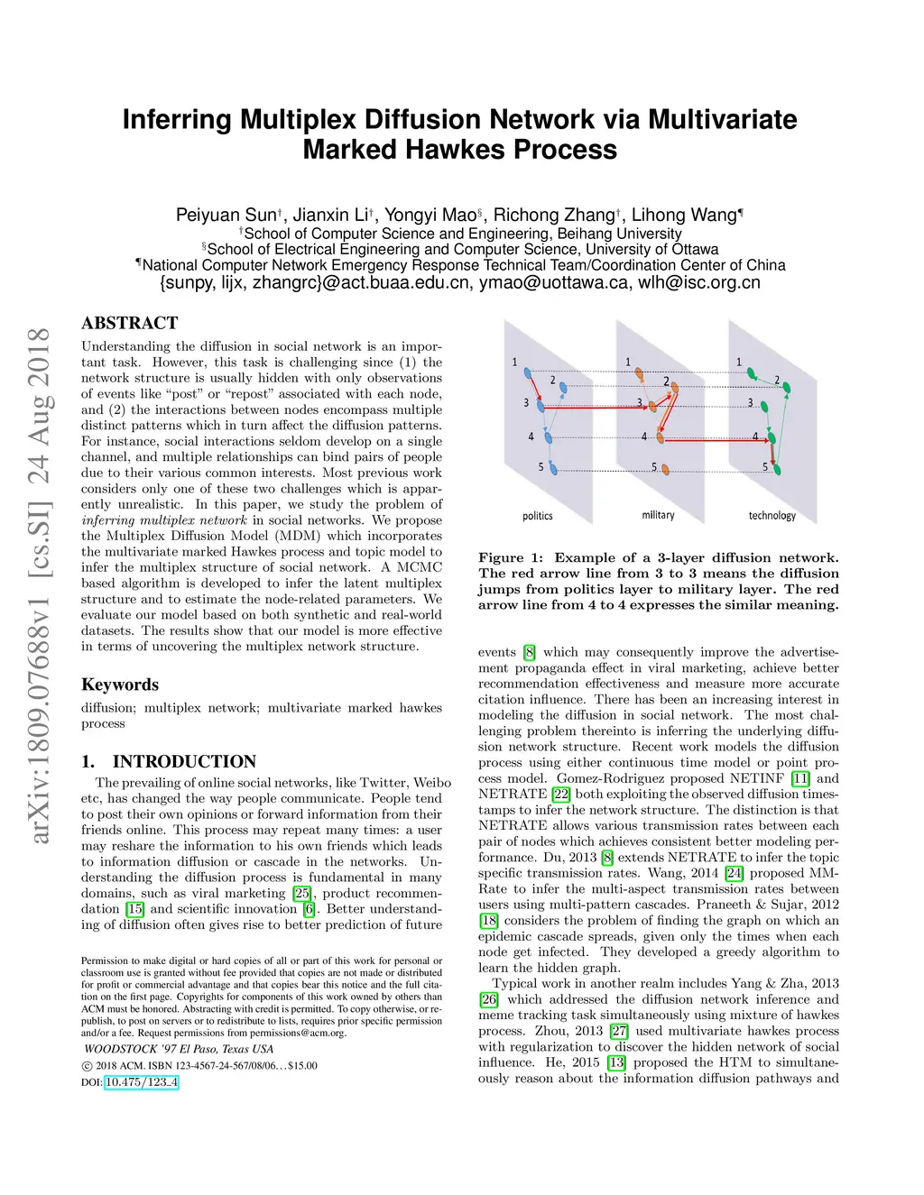 Understanding the diffusion in social network is an important task. However, this task is challenging since (1) the network structure is usually hidden with only observations of events like "post" or "repost" associated with each node, and (2) the interactions between nodes encompass multiple distinct patterns which in turn affect the diffusion patterns. For instance, social interactions seldom develop on a single channel, and multiple relationships can bind pairs of people due to their various common interests. Most previous work considers only one of these two challenges which is apparently unrealistic. In this paper, we study the problem of \emph{inferring multiplex network} in social networks. We propose the Multiplex Diffusion Model (MDM) which incorporates the multivariate marked Hawkes process and topic model to infer the multiplex structure of social network. A MCMC based algorithm is developed to infer the latent multiplex structure and to estimate the node-related parameters. We evaluate our model based on both synthetic and real-world datasets. The results show that our model is more effective in terms of uncovering the multiplex network structure.