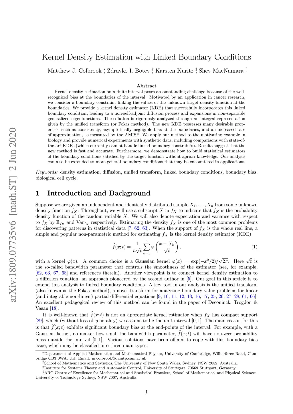 Kernel density estimation on a finite interval poses an outstanding challenge because of the well-recognized bias at the boundaries of the interval. Motivated by an application in cancer research, we consider a boundary constraint linking the values of the unknown target density function at the boundaries. For this application, ignoring the boundary condition results in inaccurate molecular kinetics which can compromise the interpretation of results when studying cytostatic drugs for cancer treatment. We provide a kernel density estimator (KDE) that successfully incorporates this linked boundary condition, leading to a non-self-adjoint diffusion process and an expansion in non-separable generalized eigenfunctions of the spatial differential operator. The solution is rigorously analyzed through the unified transform (or Fokas method), giving rise to an integral representation in the complex plane. Our analysis confirms that the new KDE possesses many desirable properties, such as consistency and asymptotically negligible bias at the boundaries. These properties include an increased rate of approximation, as measured by the AMISE. We apply our method to the motivating example in biology and provide numerical experiments with synthetic data, including comparisons with state-of-the-art KDEs. Results suggest that the new method is fast and accurate, and compares favourably with existing methods (which currently cannot handle linked boundary constraints). Furthermore, we demonstrate how to build statistical estimators of the boundary conditions satisfied by the target function, without apriori knowledge, in tangent with the corresponding kernel. Finally, our analysis can be extended to more general boundary conditions that may be encountered in applications.