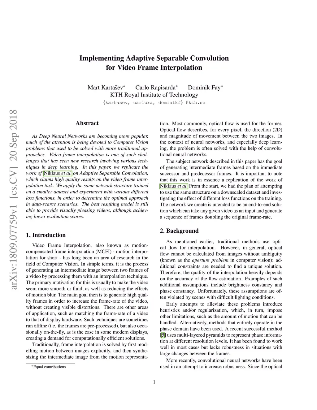 As Deep Neural Networks are becoming more popular, much of the attention is being devoted to Computer Vision problems that used to be solved with more traditional approaches. Video frame interpolation is one of such challenges that has seen new research involving various techniques in deep learning. In this paper, we replicate the work of Niklaus et al. on Adaptive Separable Convolution, which claims high quality results on the video frame interpolation task. We apply the same network structure trained on a smaller dataset and experiment with various different loss functions, in order to determine the optimal approach in data-scarce scenarios. The best resulting model is still able to provide visually pleasing videos, although achieving lower evaluation scores.