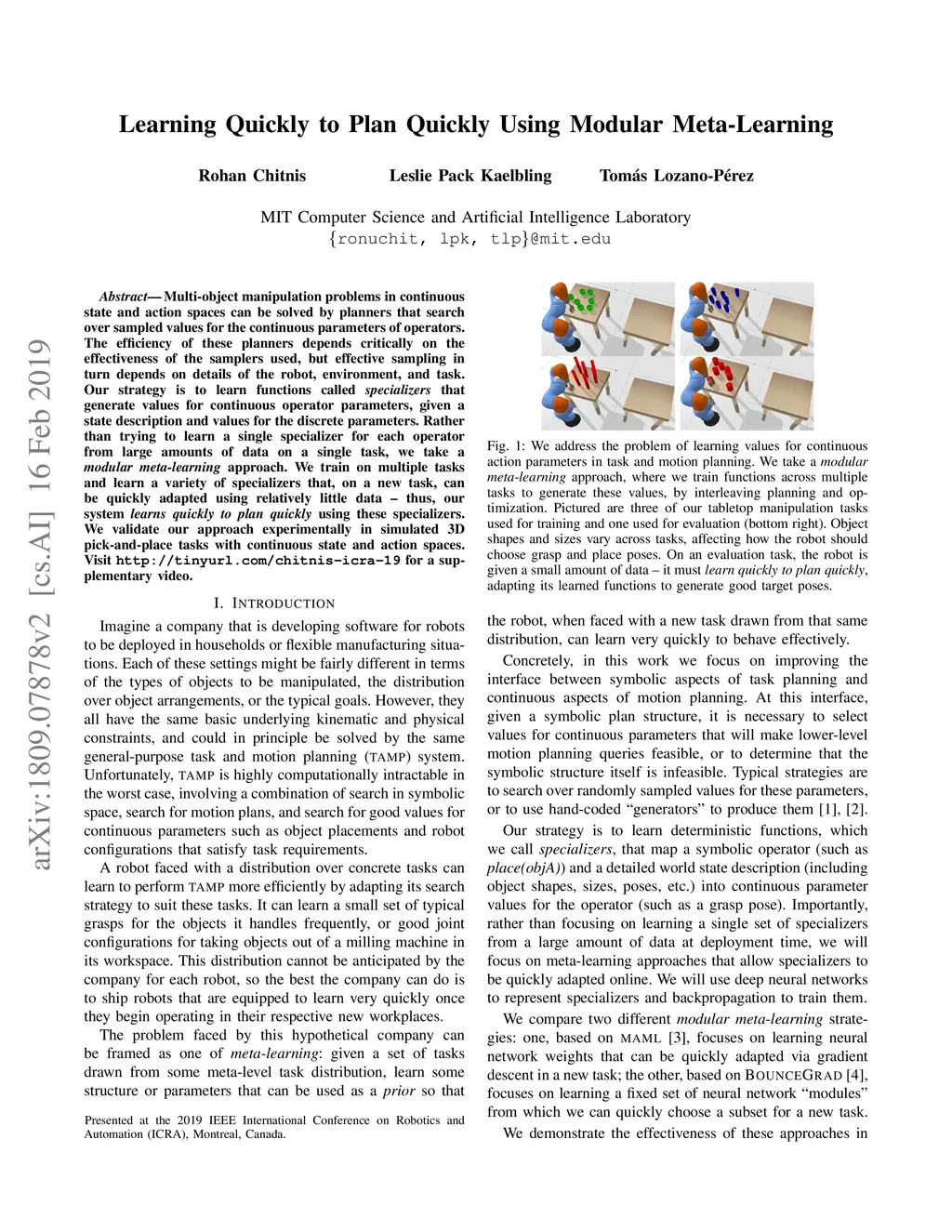 Multi-object manipulation problems in continuous state and action spaces can be solved by planners that search over sampled values for the continuous parameters of operators. The efficiency of these planners depends critically on the effectiveness of the samplers used, but effective sampling in turn depends on details of the robot, environment, and task. Our strategy is to learn functions called "specializers" that generate values for continuous operator parameters, given a state description and values for the discrete parameters. Rather than trying to learn a single specializer for each operator from large amounts of data on a single task, we take a modular meta-learning approach. We train on multiple tasks and learn a variety of specializers that, on a new task, can be quickly adapted using relatively little data -- thus, our system "learns quickly to plan quickly" using these specializers. We validate our approach experimentally in simulated 3D pick-and-place tasks with continuous state and action spaces. Visit http://tinyurl.com/chitnis-icra-19 for a supplementary video.