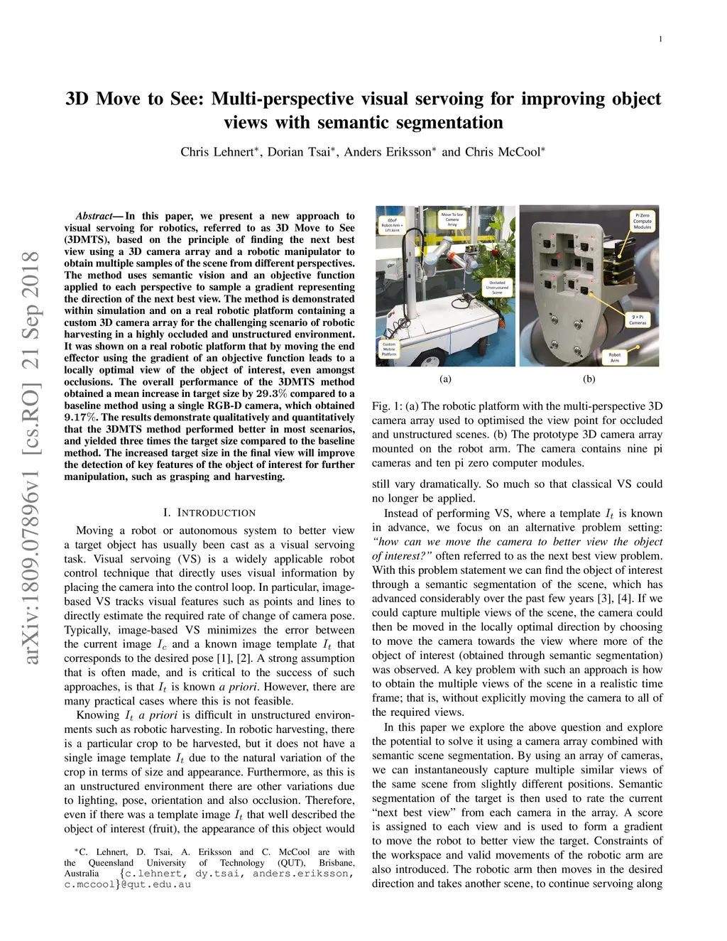 In this paper, we present a new approach to visual servoing for robotics, referred to as 3D Move to See (3DMTS), based on the principle of finding the next best view using a 3D camera array and a robotic manipulator to obtain multiple samples of the scene from different perspectives. The method uses semantic vision and an objective function applied to each perspective to sample a gradient representing the direction of the next best view. The method is demonstrated within simulation and on a real robotic platform containing a custom 3D camera array for the challenging scenario of robotic harvesting in a highly occluded and unstructured environment. It was shown on a real robotic platform that by moving the end effector using the gradient of an objective function leads to a locally optimal view of the object of interest, even amongst occlusions. The overall performance of the 3DMTS method obtained a mean increase in target size by 29.3% compared to a baseline method using a single RGB-D camera, which obtained 9.17%. The results demonstrate qualitatively and quantitatively that the 3DMTS method performed better in most scenarios, and yielded three times the target size compared to the baseline method. The increased target size in the final view will improve the detection of key features of the object of interest for further manipulation, such as grasping and harvesting.