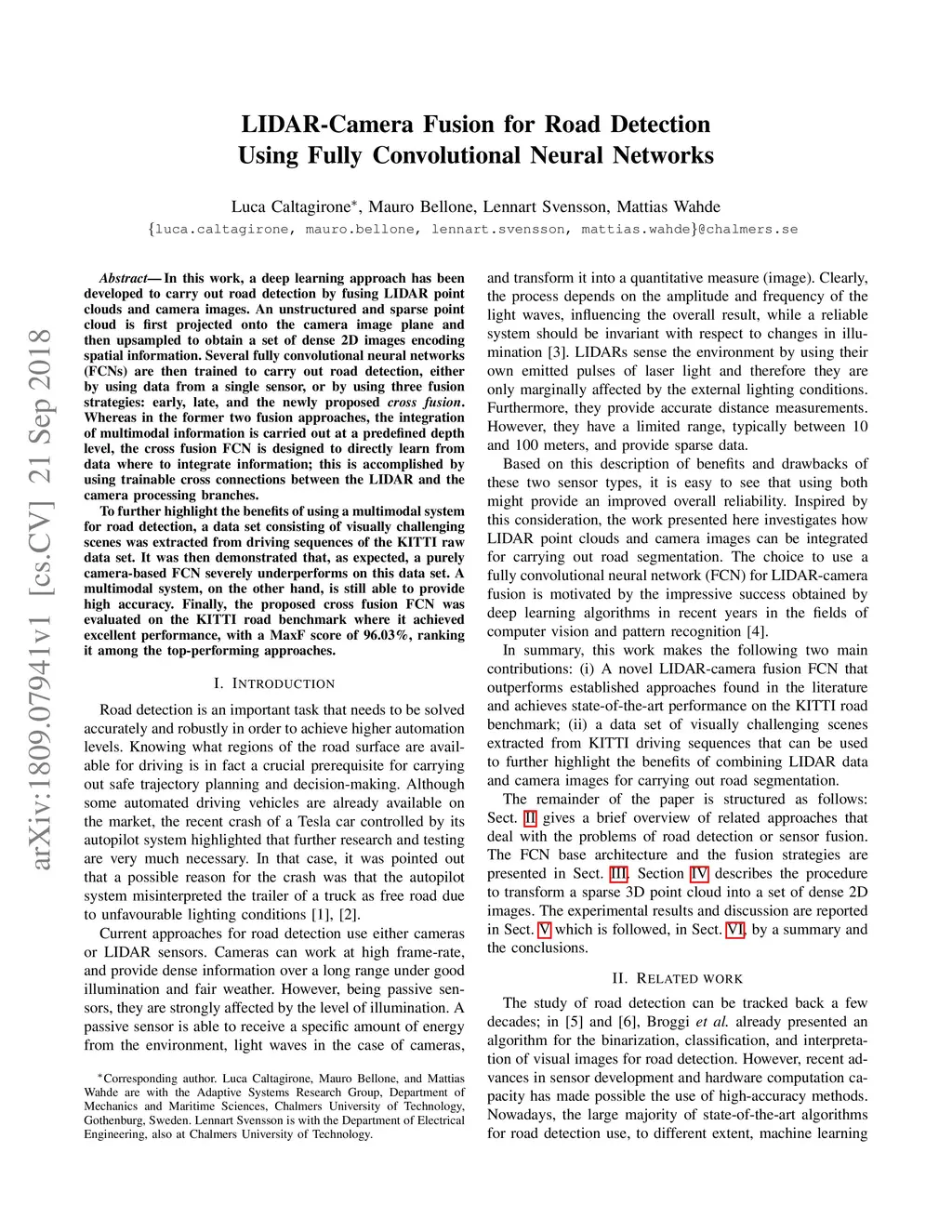 In this work, a deep learning approach has been developed to carry out road detection by fusing LIDAR point clouds and camera images. An unstructured and sparse point cloud is first projected onto the camera image plane and then upsampled to obtain a set of dense 2D images encoding spatial information. Several fully convolutional neural networks (FCNs) are then trained to carry out road detection, either by using data from a single sensor, or by using three fusion strategies: early, late, and the newly proposed cross fusion. Whereas in the former two fusion approaches, the integration of multimodal information is carried out at a predefined depth level, the cross fusion FCN is designed to directly learn from data where to integrate information; this is accomplished by using trainable cross connections between the LIDAR and the camera processing branches. To further highlight the benefits of using a multimodal system for road detection, a data set consisting of visually challenging scenes was extracted from driving sequences of the KITTI raw data set. It was then demonstrated that, as expected, a purely camera-based FCN severely underperforms on this data set. A multimodal system, on the other hand, is still able to provide high accuracy. Finally, the proposed cross fusion FCN was evaluated on the KITTI road benchmark where it achieved excellent performance, with a MaxF score of 96.03%, ranking it among the top-performing approaches.