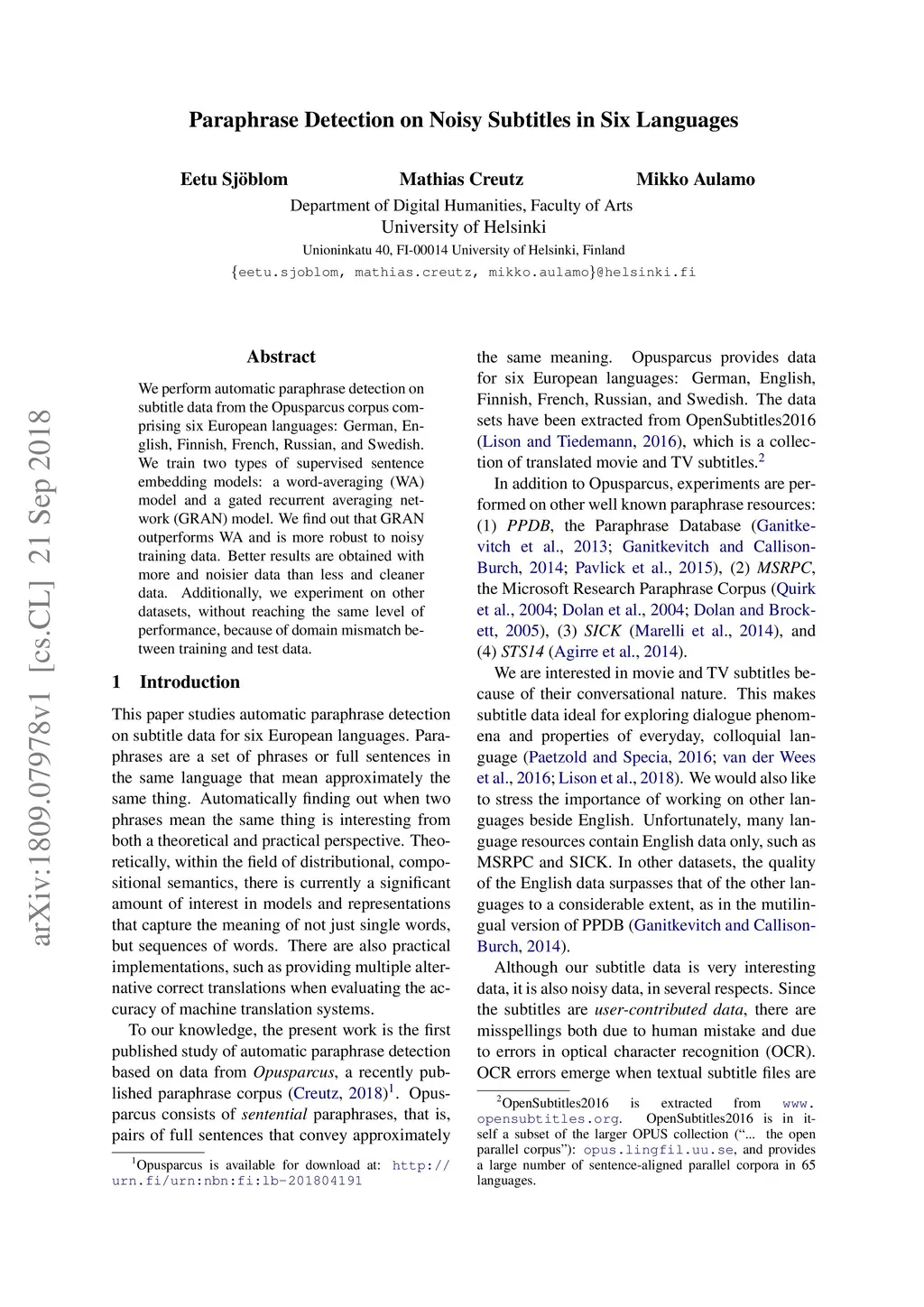Paraphrase Detection on Noisy Subtitles in Six Languages